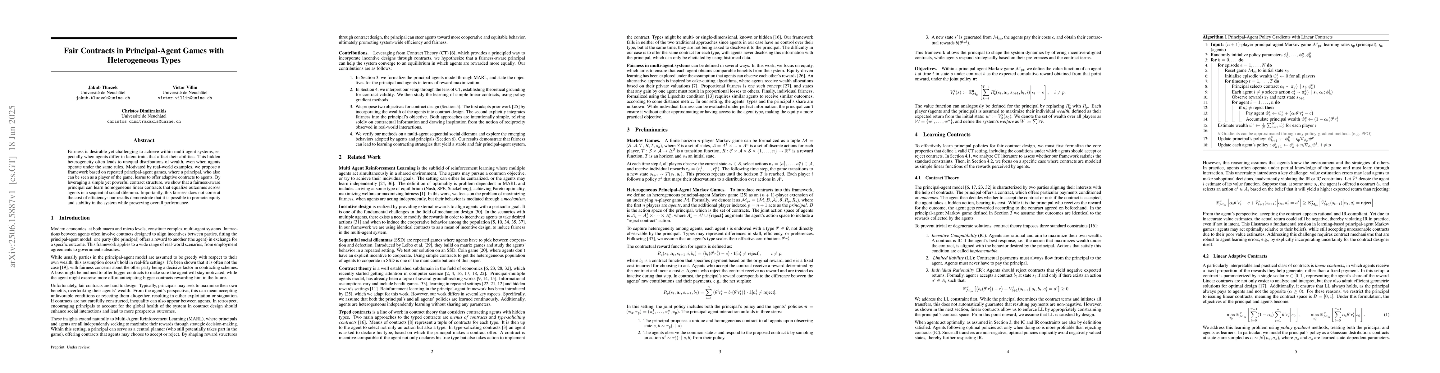 Fairness is desirable yet challenging to achieve within multi-agent systems, especially when agents differ in latent traits that affect their abilities. This hidden heterogeneity often leads to unequal distributions of wealth, even when agents operate under the same rules. Motivated by real-world examples, we propose a framework based on repeated principal-agent games, where a principal, who also can be seen as a player of the game, learns to offer adaptive contracts to agents. By leveraging a simple yet powerful contract structure, we show that a fairness-aware principal can learn homogeneous linear contracts that equalize outcomes across agents in a sequential social dilemma. Importantly, this fairness does not come at the cost of efficiency: our results demonstrate that it is possible to promote equity and stability in the system while preserving overall performance.