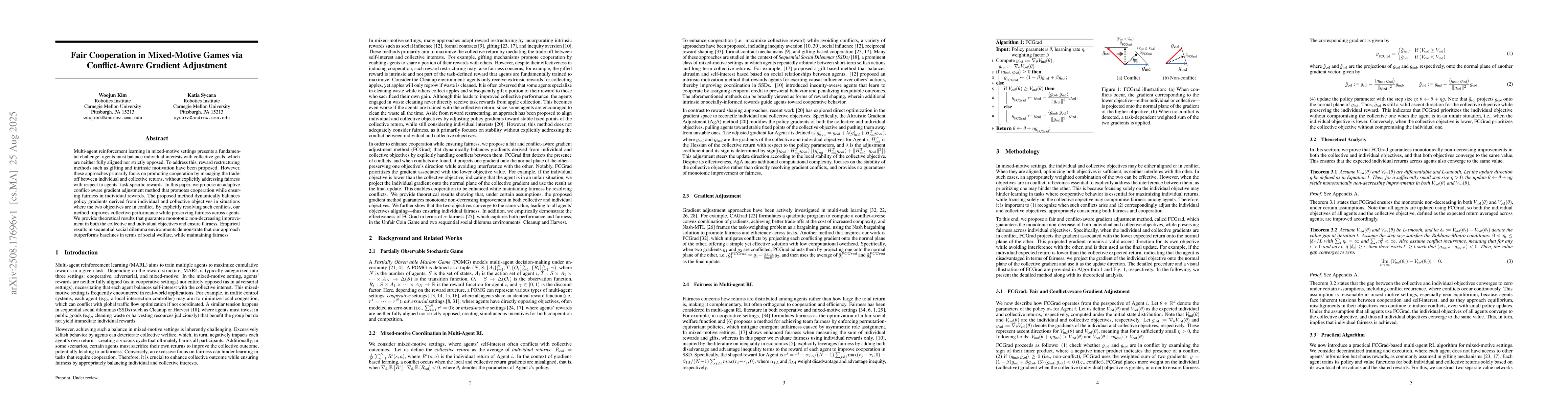 Multi-agent reinforcement learning in mixed-motive settings presents a fundamental challenge: agents must balance individual interests with collective goals, which are neither fully aligned nor strictly opposed. To address this, reward restructuring methods such as gifting and intrinsic motivation have been proposed. However, these approaches primarily focus on promoting cooperation by managing the trade-off between individual and collective returns, without explicitly addressing fairness with respect to the agents' task-specific rewards. In this paper, we propose an adaptive conflict-aware gradient adjustment method that promotes cooperation while ensuring fairness in individual rewards. The proposed method dynamically balances policy gradients derived from individual and collective objectives in situations where the two objectives are in conflict. By explicitly resolving such conflicts, our method improves collective performance while preserving fairness across agents. We provide theoretical results that guarantee monotonic non-decreasing improvement in both the collective and individual objectives and ensure fairness. Empirical results in sequential social dilemma environments demonstrate that our approach outperforms baselines in terms of social welfare while ensuring fairness among agents.