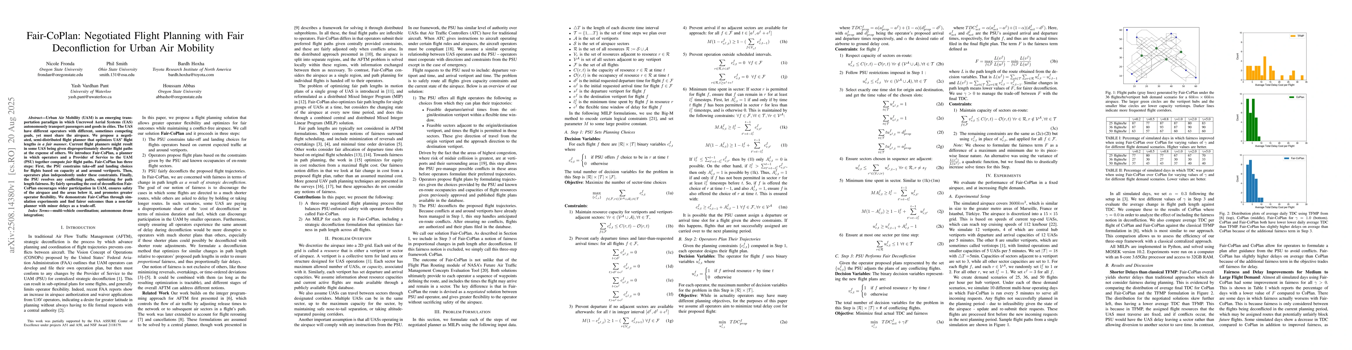 Fair-CoPlan presents a novel three-step negotiated flight planning process that optimizes flight path lengths fairly, using a combined central and distributed Mixed Integer Linear Program (MILP) solution.