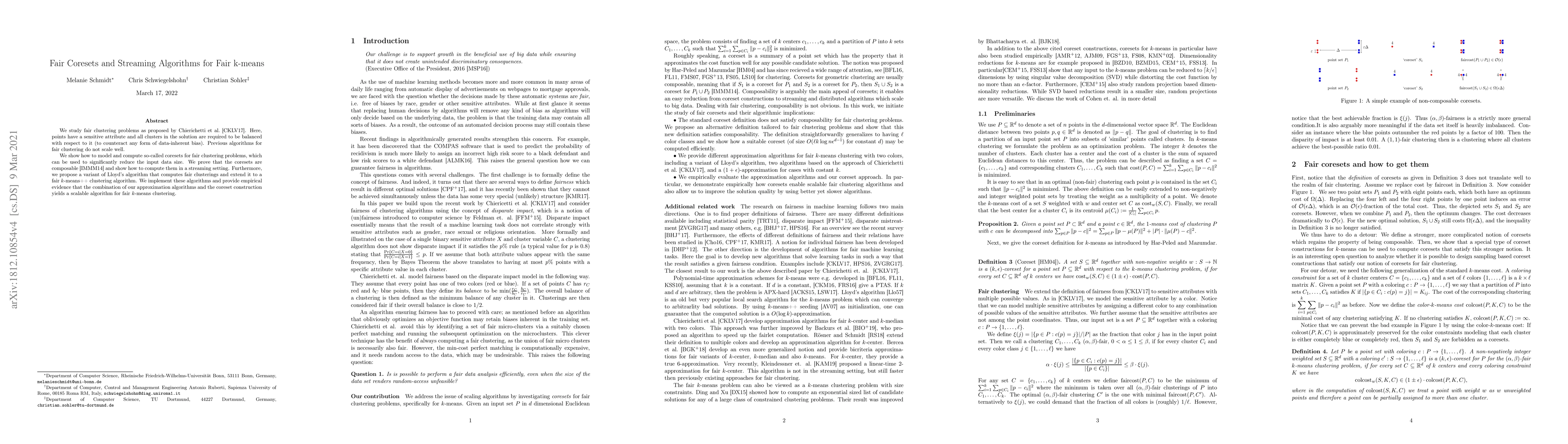 This paper proposes scalable algorithms for fair k-means clustering by introducing coresets that reduce data size and a streaming method for computing fair clusterings. It also presents a fair k-means++ variant and demonstrates its effectiveness through empirical testing.