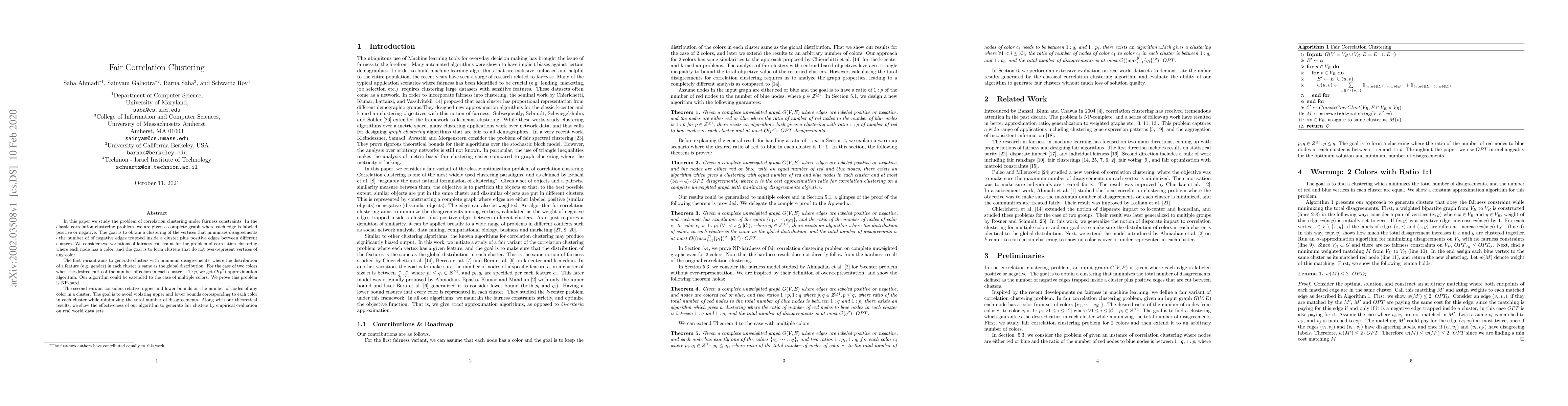 This paper addresses the correlation clustering problem with fairness constraints, proposing algorithms to form clusters that do not over-represent any color while minimizing disagreements. It presents an $\mathcal{O}(p^2)$-approximation algorithm for a two-color scenario and proves the problem's NP-hardness, along with empirical evaluations on real datasets.