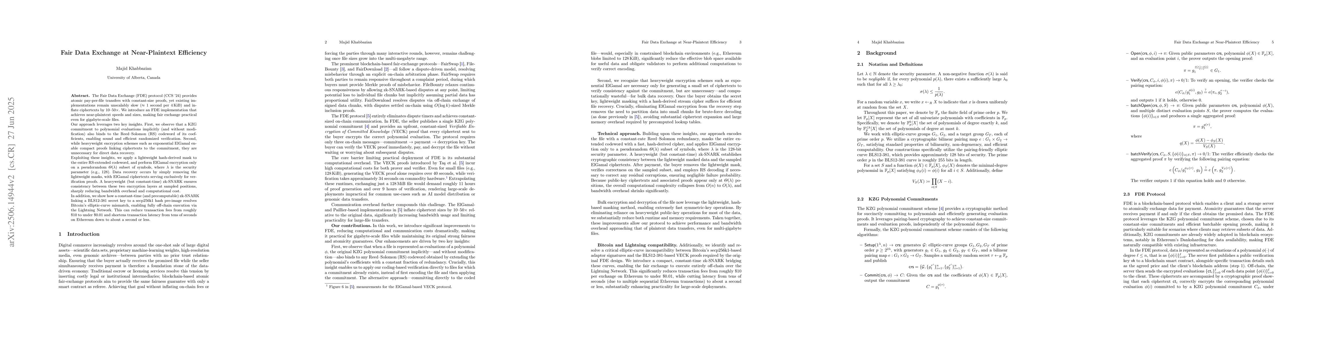 The Fair Data Exchange (FDE) protocol introduced at CCS 2024 offers atomic pay-per-file transfers with constant-size proofs, but its prover and verifier runtimes still scale linearly with the file length n. We collapse these costs to essentially constant by viewing the file as a rate-1 Reed-Solomon (RS) codeword, extending it to a lower-rate RS code with constant redundancy, encrypting this extended vector, and then proving correctness for only a small random subset of the resulting ciphertexts; RS decoding repairs any corrupted symbols with negligible failure probability. Our protocol preserves full client- and server-fairness, and adds only a tunable communication redundancy overhead. Finally, we patch the elliptic-curve mismatch in the Bitcoin instantiation of FDE with a compact zk-SNARK, enabling the entire exchange to run off-chain and falling back to just two on-chain transactions when channels are unavailable.