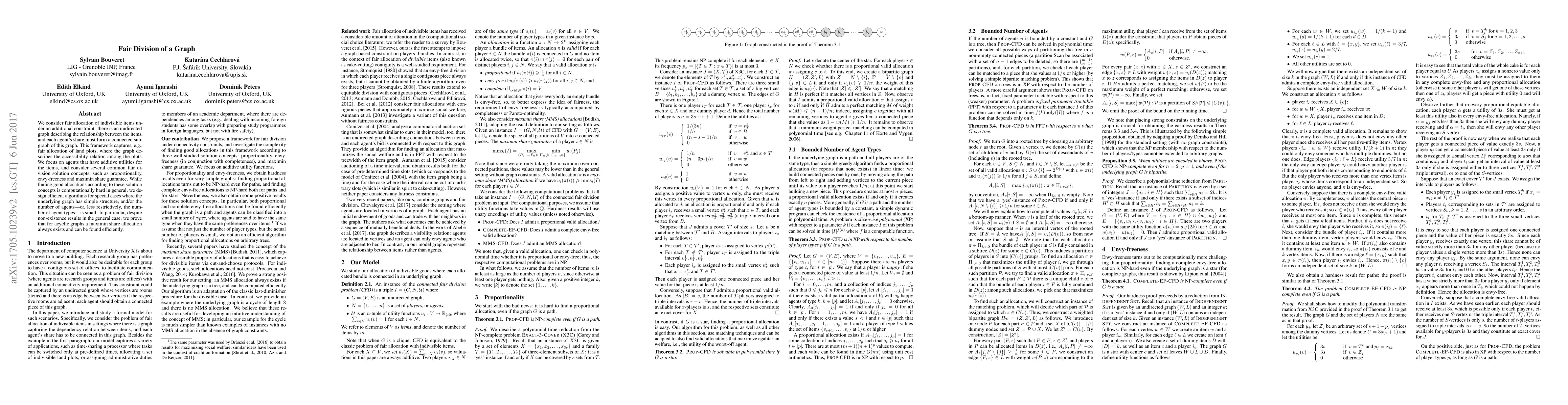 This paper explores fair allocation of indivisible items constrained by a graph representing item relationships, ensuring each agent's share forms a connected subgraph. It addresses fair division under concepts like proportionality and envy-freeness, presenting efficient algorithms for special cases, notably proving the existence of maximin share allocations in acyclic graphs.