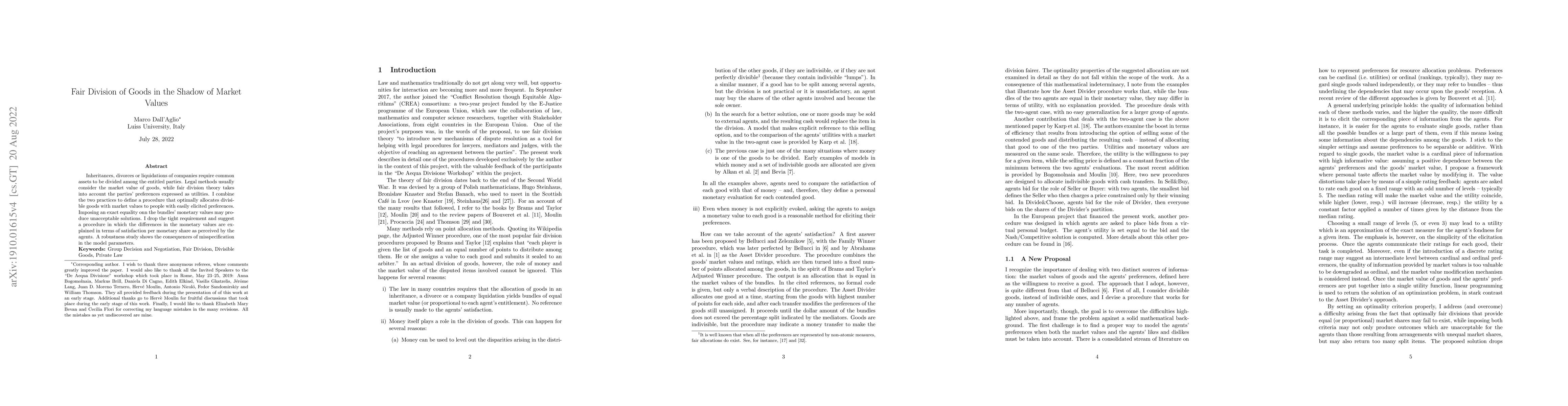 This paper proposes a fair division procedure that combines market values and individual preferences to allocate divisible goods among entitled parties. It suggests a flexible approach that prioritizes satisfaction over exact monetary equality, and includes a robustness study on model parameter misspecification.