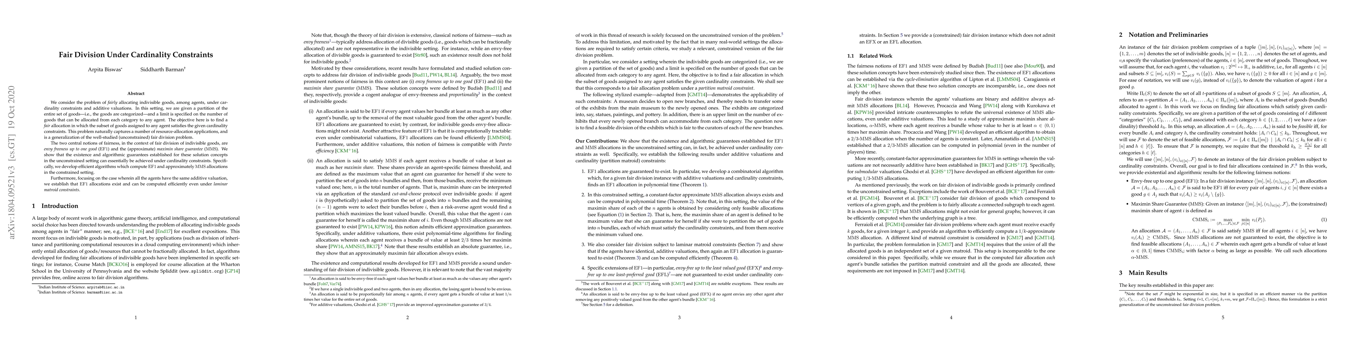 The paper analyzes fair division problems under cardinality constraints with additive valuations, focusing on envy-freeness up to one good (EF1) and maximin share (MMS) guarantees. It develops efficient algorithms for computing EF1 and approximate MMS allocations, and establishes existence results for EF1 under laminar matroid constraints with identical valuations.