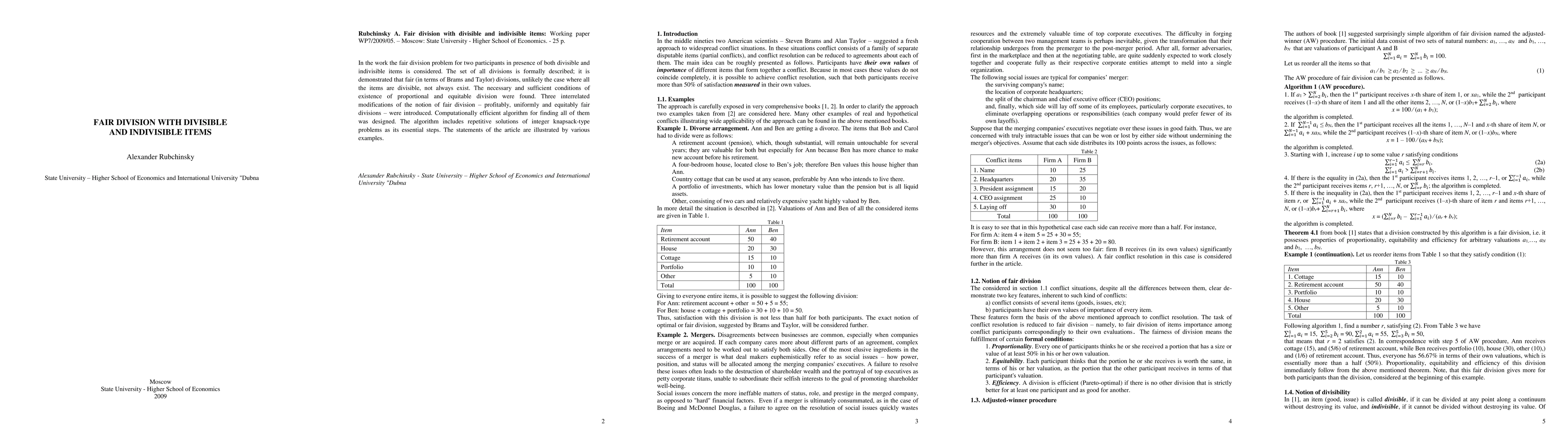 This paper explores fair division problems for two participants with both divisible and indivisible items, demonstrating that fair divisions do not always exist, unlike when all items are divisible. It identifies necessary and sufficient conditions for the existence of proportional and equitable divisions.