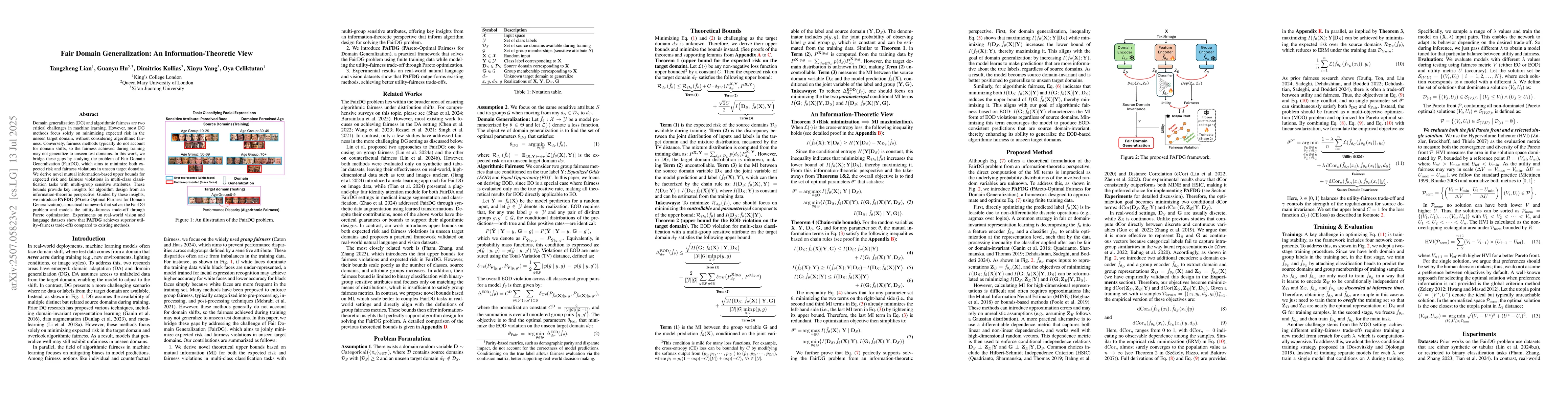Domain generalization (DG) and algorithmic fairness are two critical challenges in machine learning. However, most DG methods focus only on minimizing expected risk in the unseen target domain without considering algorithmic fairness. Conversely, fairness methods typically do not account for domain shifts, so the fairness achieved during training may not generalize to unseen test domains. In this work, we bridge these gaps by studying the problem of Fair Domain Generalization (FairDG), which aims to minimize both expected risk and fairness violations in unseen target domains. We derive novel mutual information-based upper bounds for expected risk and fairness violations in multi-class classification tasks with multi-group sensitive attributes. These bounds provide key insights for algorithm design from an information-theoretic perspective. Guided by these insights, we introduce PAFDG (Pareto-Optimal Fairness for Domain Generalization), a practical framework that solves the FairDG problem and models the utility-fairness trade-off through Pareto optimization. Experiments on real-world vision and language datasets show that PAFDG achieves superior utility-fairness trade-offs compared to existing methods.