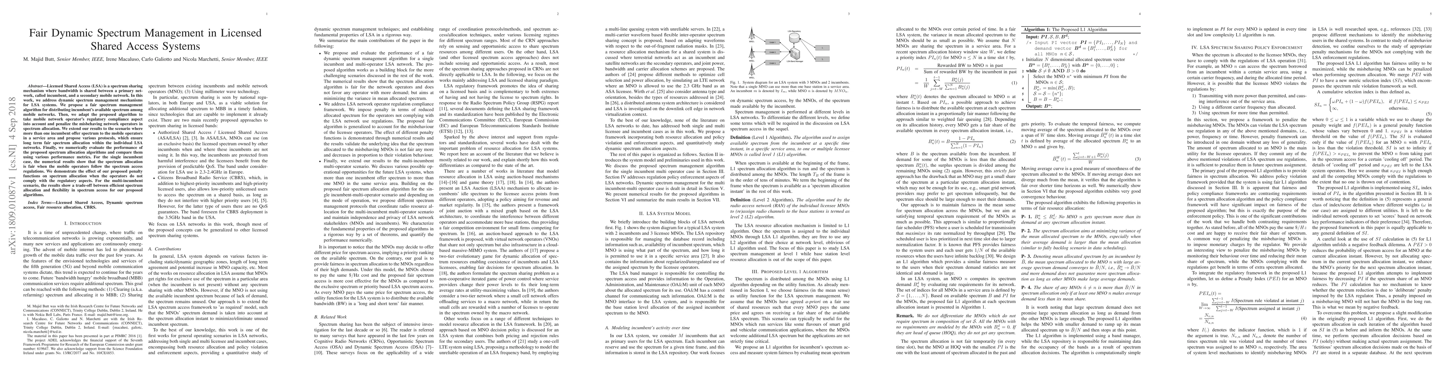 This paper proposes a fair dynamic spectrum management algorithm for Licensed Shared Access systems, ensuring equitable distribution of spectrum among secondary mobile networks while penalizing non-compliant operators. The study extends the approach to multiple incumbents and evaluates the algorithms' performance, demonstrating fair spectrum allocation when regulations are followed and the impact of penalties for non-compliance.