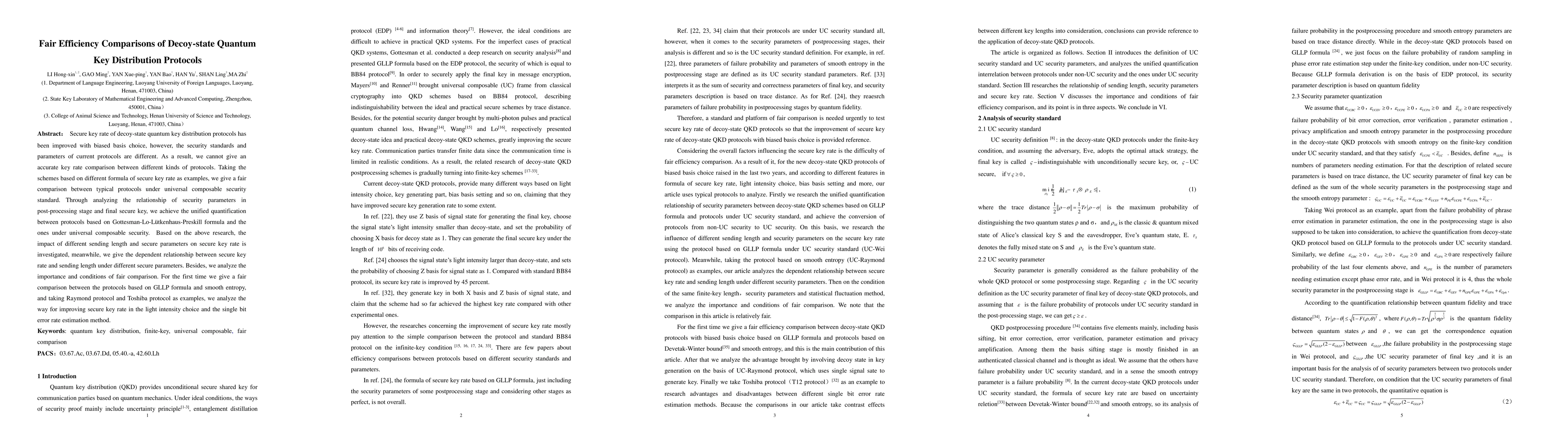 This paper compares decoy-state quantum key distribution protocols under universal composable security standards, finding a unified quantification method and analyzing the impact of sending length and secure parameters on secure key rate. It also provides a fair comparison between GLLP formula and smooth entropy protocols and offers suggestions for improving secure key rate in light intensity choice and single bit error rate estimation.