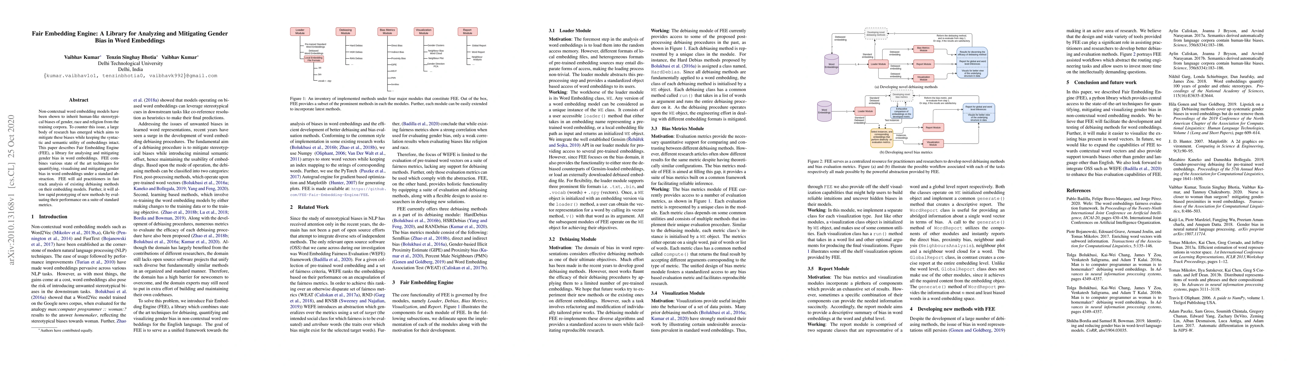 The Fair Embedding Engine (FEE) library is designed to analyze and mitigate gender bias in non-contextual word embeddings, combining advanced techniques for quantifying, visualizing, and reducing such biases while preserving the embeddings' syntactic and semantic integrity. FEE facilitates rapid evaluation of existing debiasing methods and prototyping new ones using standard metrics.