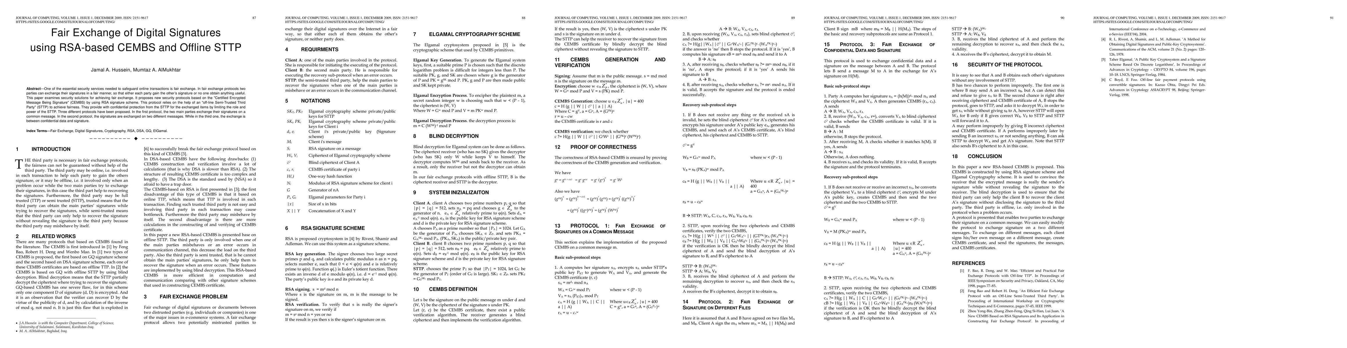 This paper proposes three new security protocols for fair exchange of digital signatures using RSA-based CEMBS with an offline STTP, aiming to provide confidential protection while limiting the role of the STTP.