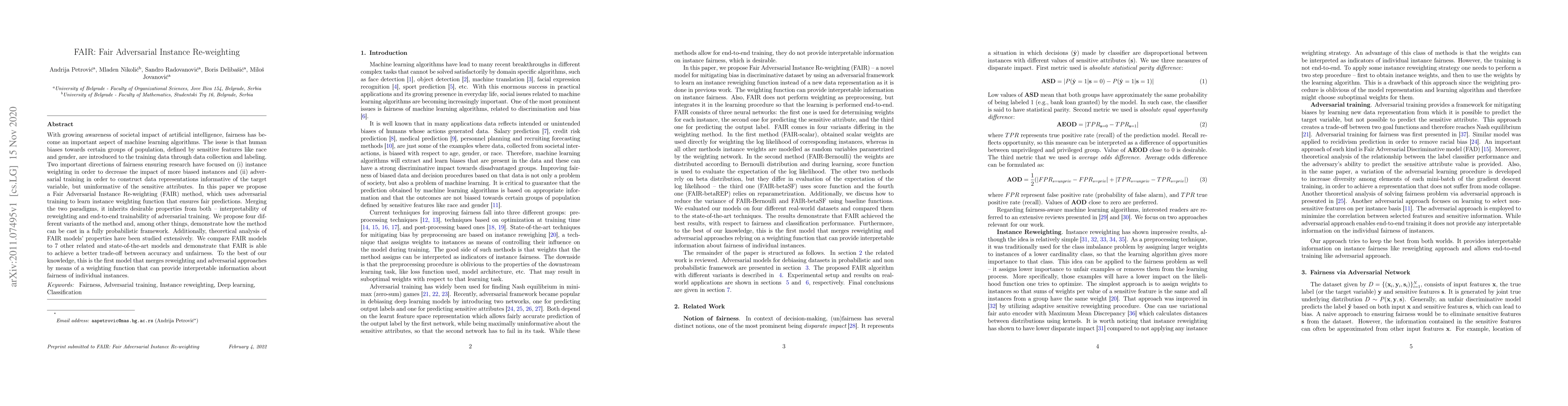 With growing awareness of societal impact of artificial intelligence, fairness has become an important aspect of machine learning algorithms. The issue is that human biases towards certain groups of population, defined by sensitive features like race and gender, are introduced to the training data through data collection and labeling. Two important directions of fairness ensuring research have focused on (i) instance weighting in order to decrease the impact of more biased instances and (ii) adversarial training in order to construct data representations informative of the target variable, but uninformative of the sensitive attributes. In this paper we propose a Fair Adversarial Instance Re-weighting (FAIR) method, which uses adversarial training to learn instance weighting function that ensures fair predictions. Merging the two paradigms, it inherits desirable properties from both -- interpretability of reweighting and end-to-end trainability of adversarial training. We propose four different variants of the method and, among other things, demonstrate how the method can be cast in a fully probabilistic framework. Additionally, theoretical analysis of FAIR models' properties have been studied extensively. We compare FAIR models to 7 other related and state-of-the-art models and demonstrate that FAIR is able to achieve a better trade-off between accuracy and unfairness. To the best of our knowledge, this is the first model that merges reweighting and adversarial approaches by means of a weighting function that can provide interpretable information about fairness of individual instances.