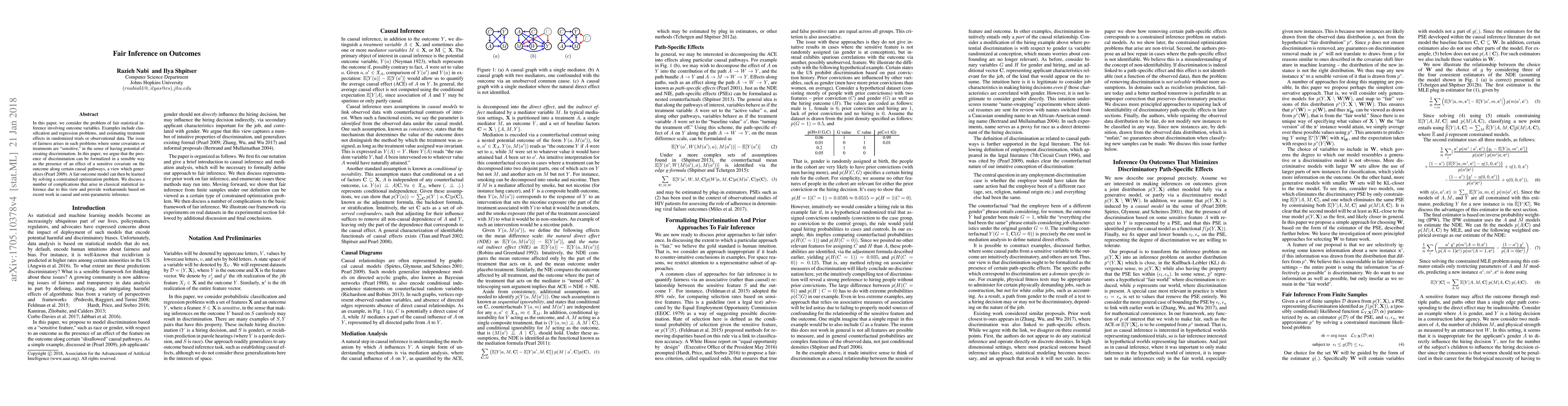 In this paper, we consider the problem of fair statistical inference involving outcome variables. Examples include classification and regression problems, and estimating treatment effects in randomized trials or observational data. The issue of fairness arises in such problems where some covariates or treatments are "sensitive," in the sense of having potential of creating discrimination. In this paper, we argue that the presence of discrimination can be formalized in a sensible way as the presence of an effect of a sensitive covariate on the outcome along certain causal pathways, a view which generalizes (Pearl, 2009). A fair outcome model can then be learned by solving a constrained optimization problem. We discuss a number of complications that arise in classical statistical inference due to this view and provide workarounds based on recent work in causal and semi-parametric inference.