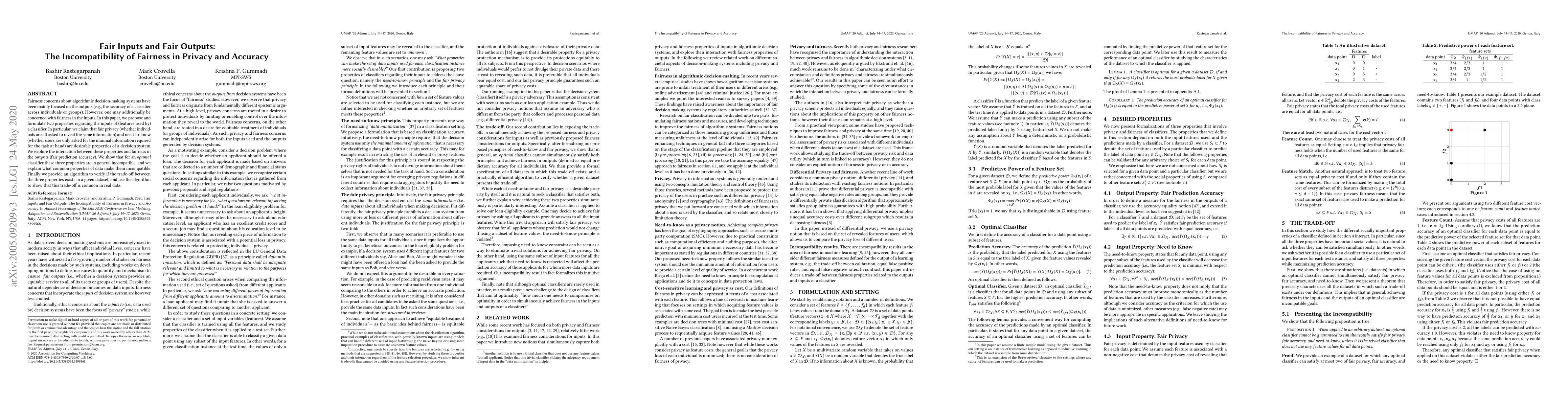Fairness concerns about algorithmic decision-making systems have been mainly focused on the outputs (e.g., the accuracy of a classifier across individuals or groups). However, one may additionally be concerned with fairness in the inputs. In this paper, we propose and formulate two properties regarding the inputs of (features used by) a classifier. In particular, we claim that fair privacy (whether individuals are all asked to reveal the same information) and need-to-know (whether users are only asked for the minimal information required for the task at hand) are desirable properties of a decision system. We explore the interaction between these properties and fairness in the outputs (fair prediction accuracy). We show that for an optimal classifier these three properties are in general incompatible, and we explain what common properties of data make them incompatible. Finally we provide an algorithm to verify if the trade-off between the three properties exists in a given dataset, and use the algorithm to show that this trade-off is common in real data.