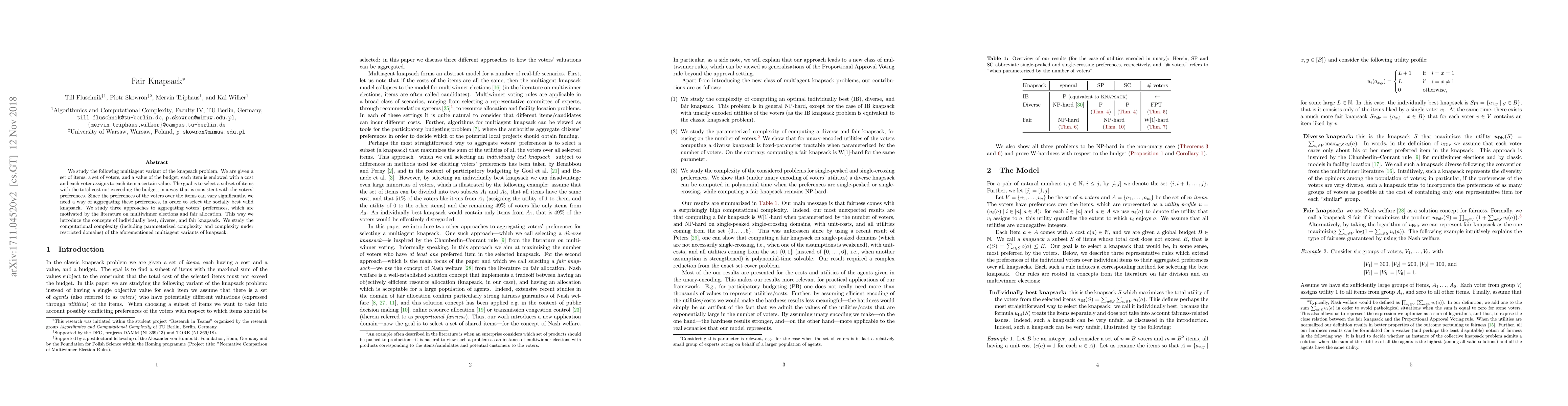 Researchers study a multiagent variant of the knapsack problem to select items that meet voters' preferences while staying within a budget. They propose three approaches for aggregating voter preferences, leading to concepts like individually best, diverse, and fair knapsack solutions.