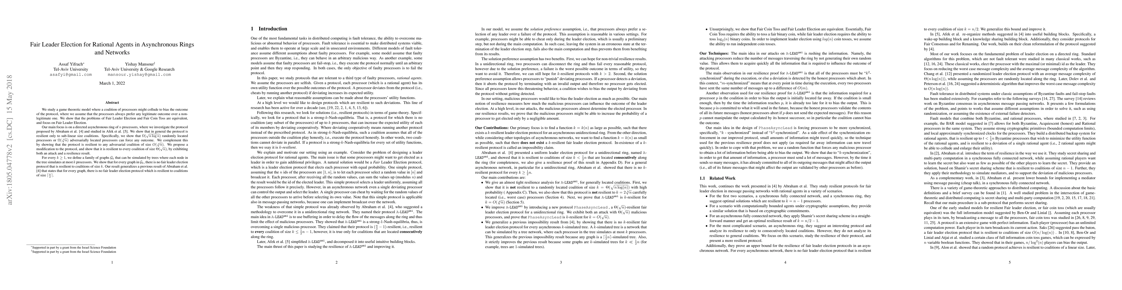 We study a game theoretic model where a coalition of processors might collude to bias the outcome of the protocol, where we assume that the processors always prefer any legitimate outcome over a non-legitimate one. We show that the problems of Fair Leader Election and Fair Coin Toss are equivalent, and focus on Fair Leader Election. Our main focus is on a directed asynchronous ring of $n$ processors, where we investigate the protocol proposed by Abraham et al. \cite{abraham2013distributed} and studied in Afek et al. \cite{afek2014distributed}. We show that in general the protocol is resilient only to sub-linear size coalitions. Specifically, we show that $\Omega(\sqrt{n\log n})$ randomly located processors or $\Omega(\sqrt[3]{n})$ adversarially located processors can force any outcome. We complement this by showing that the protocol is resilient to any adversarial coalition of size $O(\sqrt[4]{n})$. We propose a modification to the protocol, and show that it is resilient to every coalition of size $\Theta(\sqrt{n})$, by exhibiting both an attack and a resilience result. For every $k \geq 1$, we define a family of graphs ${\mathcal{G}}_{k}$ that can be simulated by trees where each node in the tree simulates at most $k$ processors. We show that for every graph in ${\mathcal{G}}_{k}$, there is no fair leader election protocol that is resilient to coalitions of size $k$. Our result generalizes a previous result of Abraham et al. \cite{abraham2013distributed} that states that for every graph, there is no fair leader election protocol which is resilient to coalitions of size $\lceil \frac{n}{2} \rceil$.