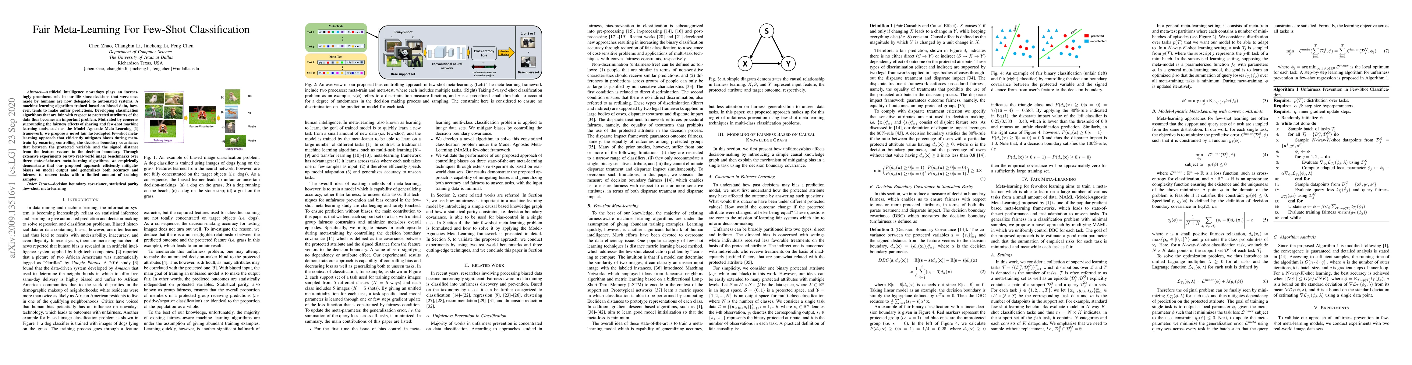 This paper proposes a novel fair few-shot meta-learning approach to mitigate biases in classification algorithms, ensuring control over the covariance between protected attributes and decision boundary distances. Experimental results on image benchmarks show improved fairness and generalization with limited training samples.