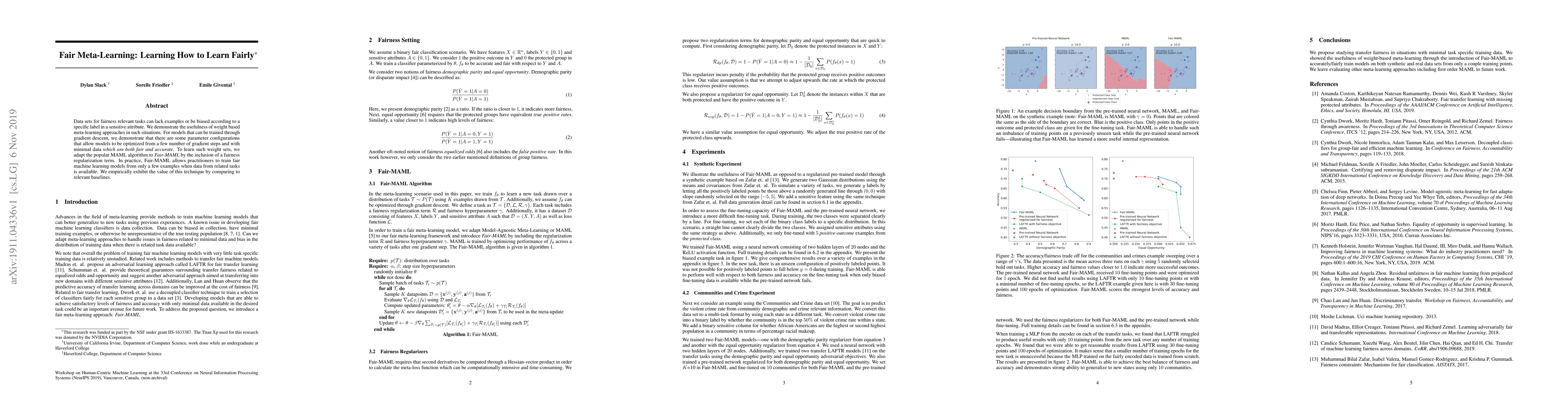 This paper proposes Fair-MAML, an adaptation of the MAML algorithm that incorporates a fairness regularization term to train fair machine learning models with minimal data. The method demonstrates improved fairness and accuracy in scenarios where datasets are limited or biased.
