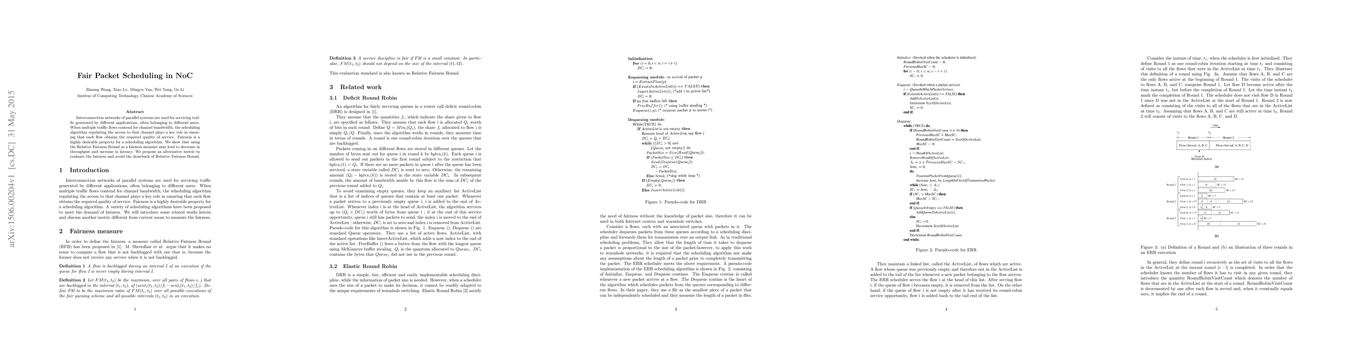 Interconnection networks of parallel systems are used for servicing traf- fic generated by different applications, often belonging to different users. When multiple traffic flows contend for channel bandwidth, the scheduling algorithm regulating the access to that channel plays a key role in ensur- ing that each flow obtains the required quality of service. Fairness is a highly desirable property for a scheduling algorithm. We show that using the Relative Fairness Bound as a fairness measure may lead to decrease in throughput and increase in latency. We propose an alternative metric to evaluate the fairness and avoid the drawback of Relative Fairness Bound.