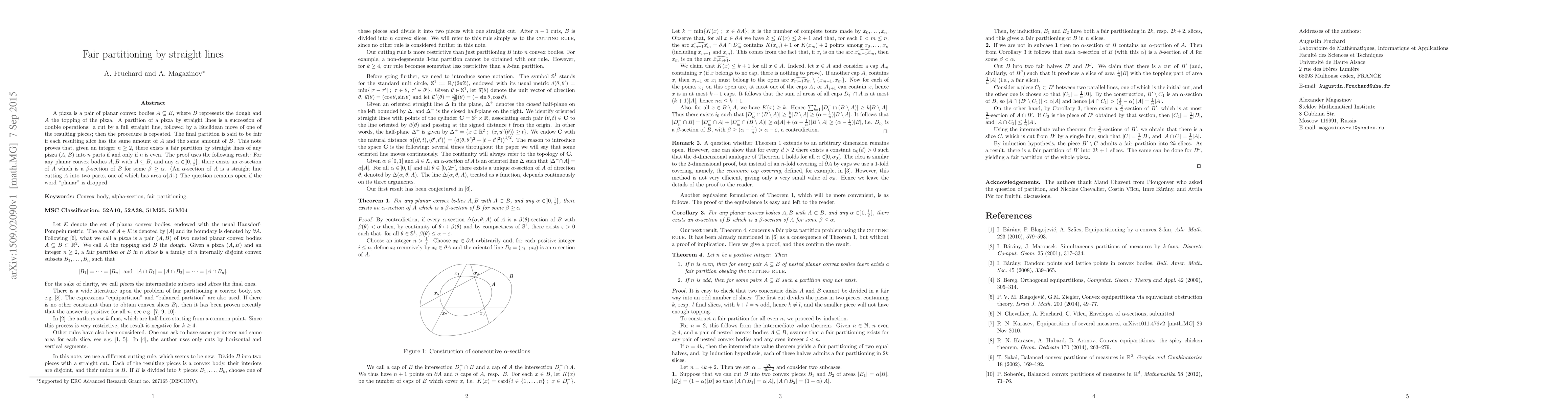A pizza is a pair of planar convex bodies $A\subseteq B$,where $B$ represents the dough and $A$ the topping of the pizza. A partition of a pizza by straight lines is a succession of double operations:a cut by a full straight line, followed by a Euclidean move of one of theresulting pieces; then the procedure is repeated.The final partition is said to be fair if each resulting slice has the same amount of $A$ and the same amount of $B$.This note proves that, given an integer $n\geq2$, there exists a fair partition by straight lines of any pizza $(A,B)$ into $n$ parts if and onlyif $n$ is even.The proof uses the following result:For any planar convex bodies $A, B$ with $A\subseteq B$, and any$\alpha\in\,]0,\frac12[\,$, there exists an $\alpha$-section of $A$ which is a$\beta$-section of $B$ for some $\beta\geq\alpha$. (An $\alpha$-section of $A$ is a straight line cutting $A$ into two parts, one of which has area $\alpha|A|$.)The question remains open if the word "planar" is dropped.