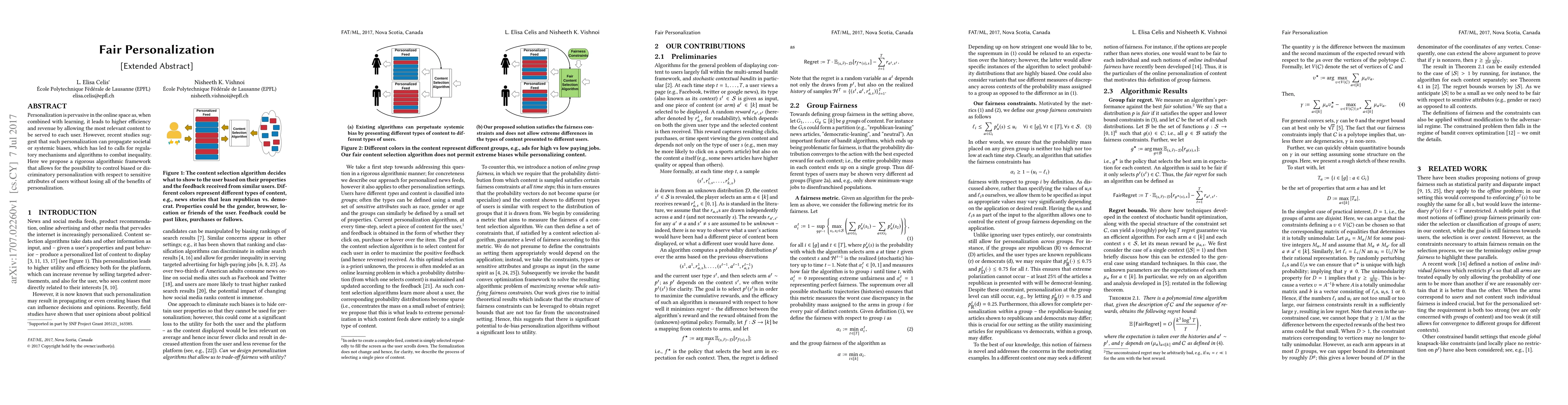 Personalization is pervasive in the online space as, when combined with learning, it leads to higher efficiency and revenue by allowing the most relevant content to be served to each user. However, recent studies suggest that such personalization can propagate societal or systemic biases, which has led to calls for regulatory mechanisms and algorithms to combat inequality. Here we propose a rigorous algorithmic framework that allows for the possibility to control biased or discriminatory personalization with respect to sensitive attributes of users without losing all of the benefits of personalization.