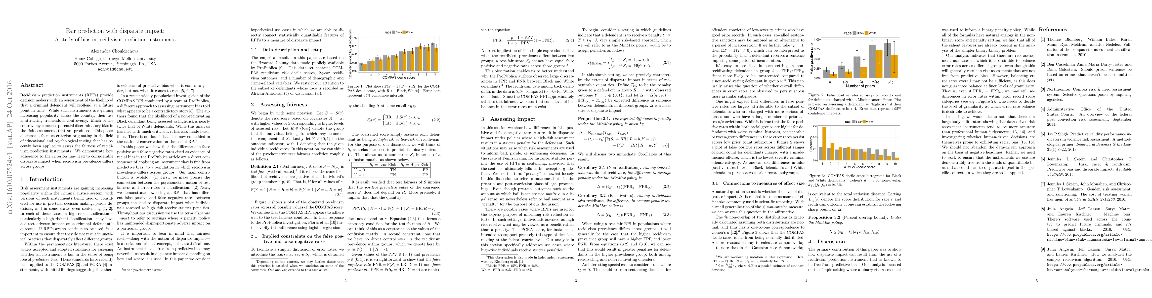 Recidivism prediction instruments provide decision makers with an assessment of the likelihood that a criminal defendant will reoffend at a future point in time. While such instruments are gaining increasing popularity across the country, their use is attracting tremendous controversy. Much of the controversy concerns potential discriminatory bias in the risk assessments that are produced. This paper discusses a fairness criterion originating in the field of educational and psychological testing that has recently been applied to assess the fairness of recidivism prediction instruments. We demonstrate how adherence to the criterion may lead to considerable disparate impact when recidivism prevalence differs across groups.