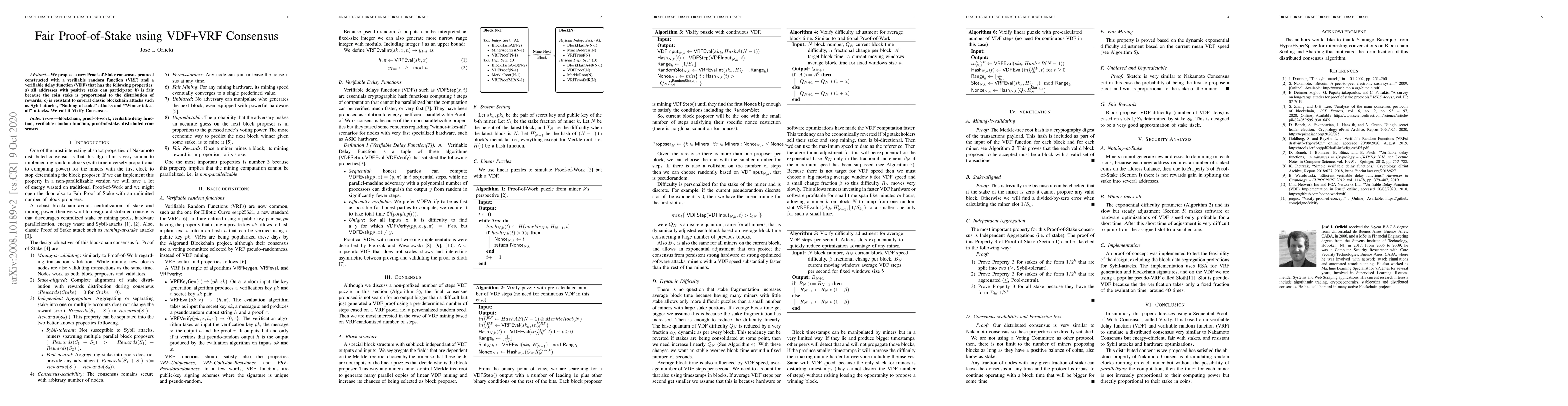 We propose a new Proof-of-Stake consensus protocol constructed with a verifiable random function (VRF) and a verifiable delay function (VDF) that has the following properties: a) all addresses with positive stake can participate; b) is fair because the coin stake is proportional to the distribution of rewards; c) is resistant to several classic blockchain attacks such as Sybil attacks, "Nothing-at-stake" attacks and "Winner-takes-all" attacks. We call it Vixify Consensus.