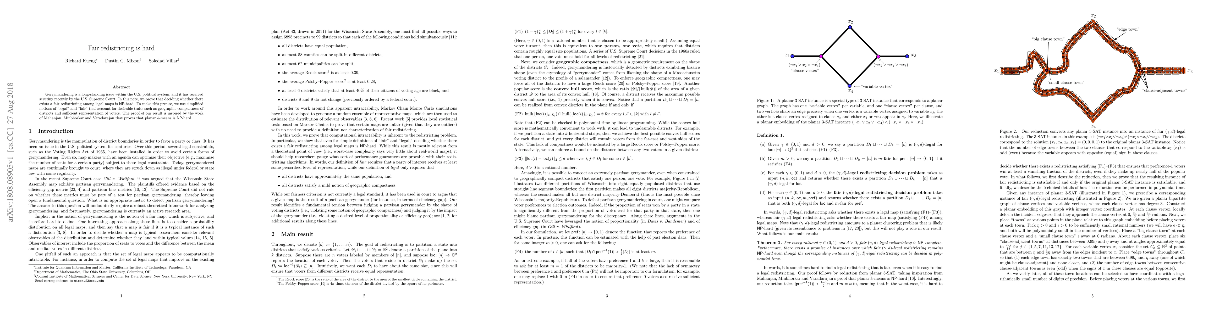 This paper demonstrates that determining whether a fair redistricting exists among legal maps is NP-hard, using simplified notions of "legal" and "fair" that include geographic compactness and voter representation. The proof is inspired by the NP-hardness of planar k-means.