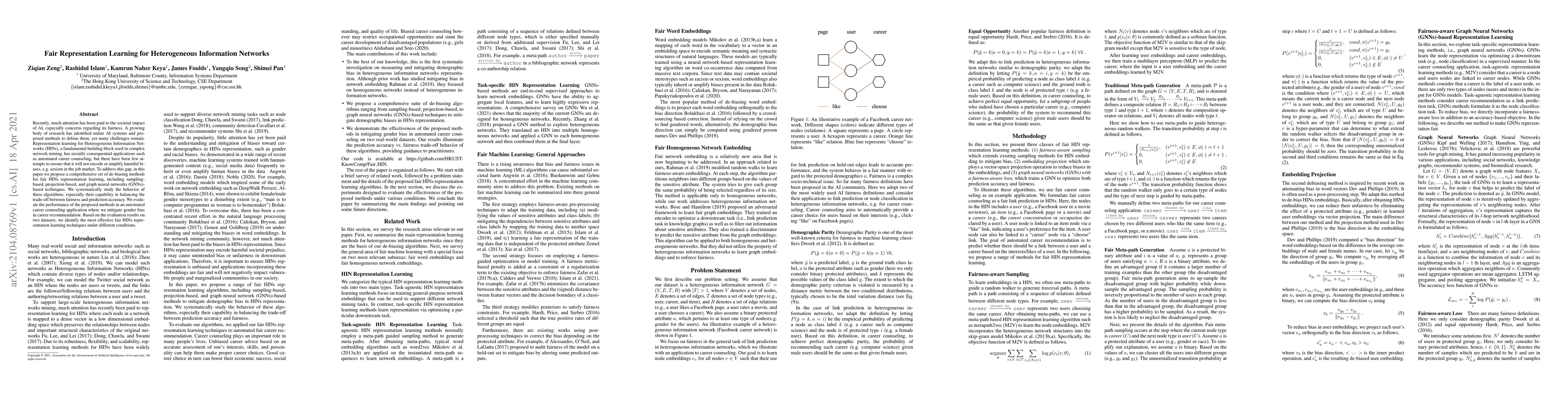 This paper proposes de-biasing methods for fair representation learning in Heterogeneous Information Networks (HINs), addressing the challenge of encoding harmful biases. The study evaluates sampling-based, projection-based, and GNNs-based techniques to balance fairness and prediction accuracy, demonstrating effectiveness in mitigating gender bias in automated career counseling.