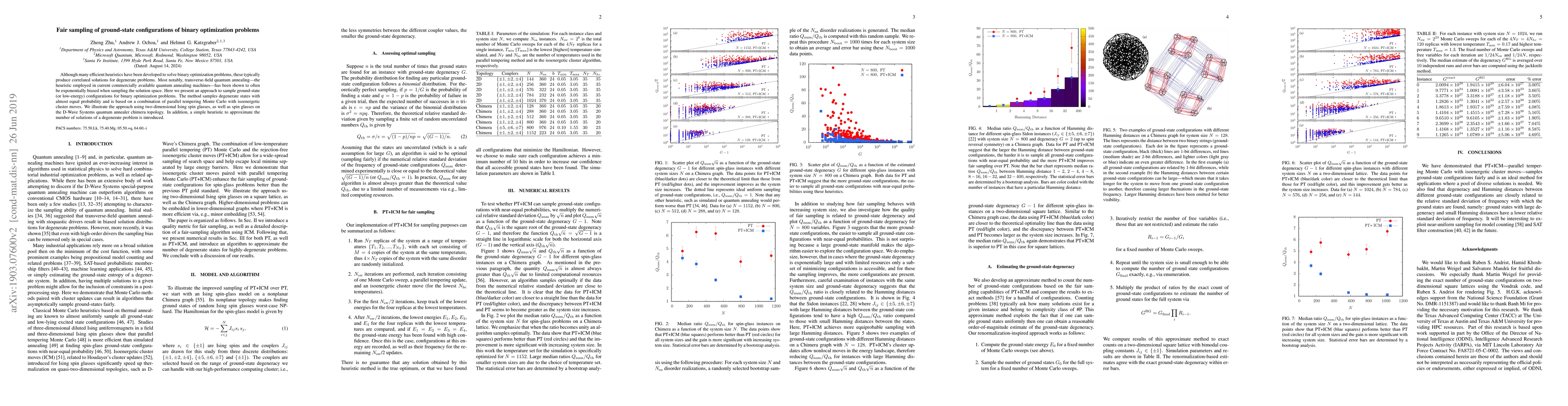 This paper proposes a method combining parallel tempering Monte Carlo and isoenergetic cluster moves to fairly sample ground-state configurations in binary optimization problems, addressing the bias in existing quantum annealing techniques. The approach is demonstrated on two-dimensional Ising spin glasses and D-Wave Systems Inc. quantum annealer topologies.