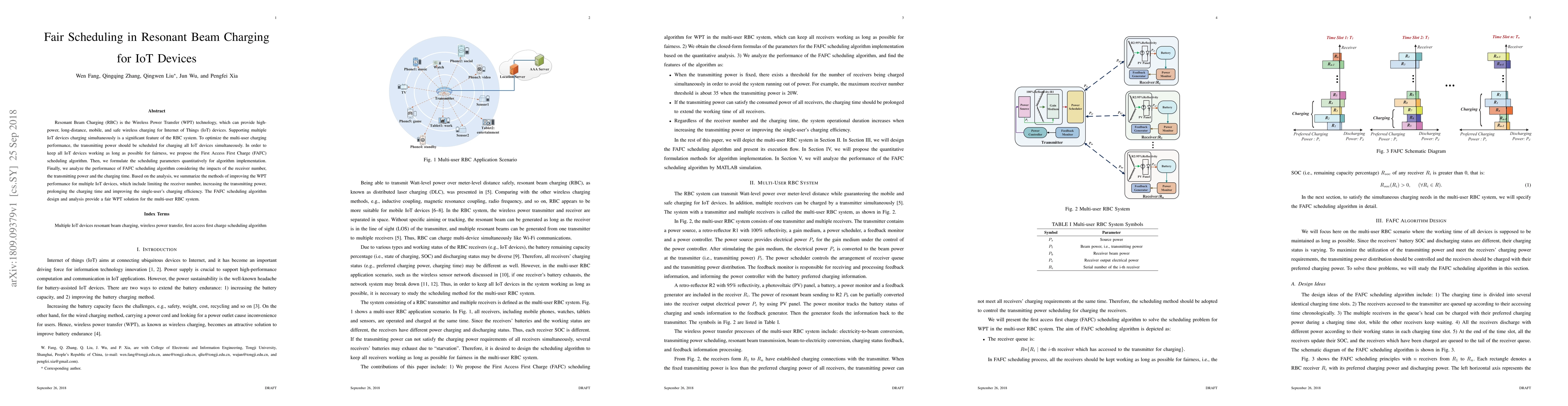 The paper proposes a First Access First Charge (FAFC) scheduling algorithm to optimize the wireless power transfer for multiple IoT devices using Resonant Beam Charging (RBC). The analysis reveals that improving WPT performance involves limiting the receiver number, increasing transmitting power, extending charging time, and enhancing single-user charging efficiency.