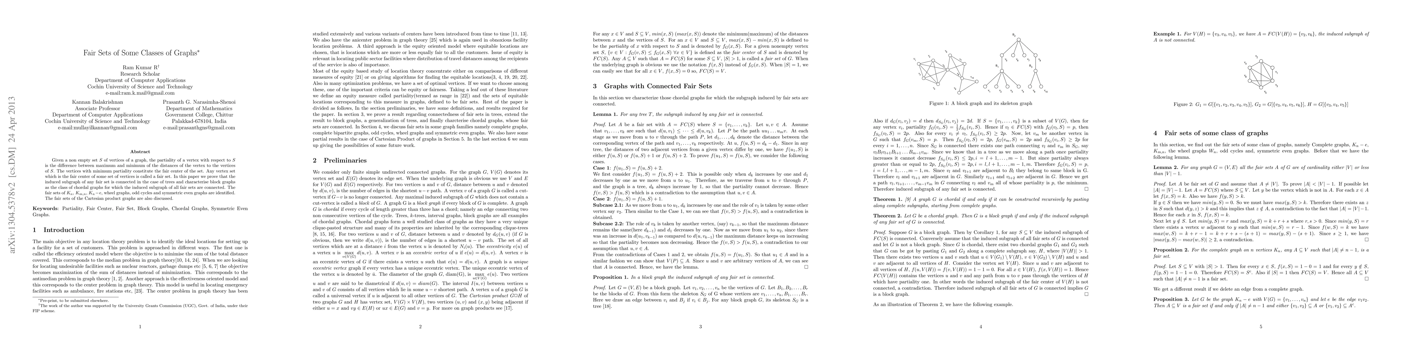 Given a non empty set $S$ of vertices of a graph, the partiality of a vertex with respect to $S$ is the difference between maximum and minimum of the distances of the vertex to the vertices of $S$. The vertices with minimum partiality constitute the fair center of the set. Any vertex set which is the fair center of some set of vertices is called a fair set. In this paper we prove that the induced subgraph of any fair set is connected in the case of trees and characterise block graphs as the class of chordal graphs for which the induced subgraph of all fair sets are connected. The fair sets of $K_{n}$, $K_{m,n}$, $K_{n}-e$, wheel graphs, odd cycles and symmetric even graphs are identified. The fair sets of the Cartesian product graphs are also discussed.