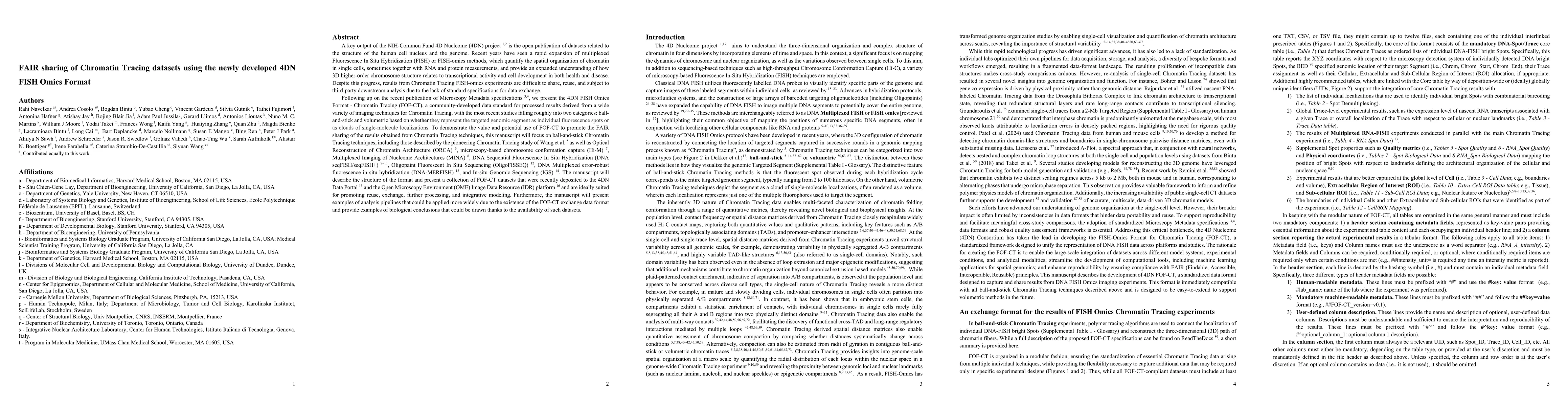 A key output of the NIH Common Fund 4D Nucleome (4DN) project is the open publication of datasets on the structure of the human cell nucleus and genome. In recent years, multiplexed Fluorescence In Situ Hybridization (FISH) and FISH-omics methods have rapidly expanded, enabling quantification of chromatin organization in single cells, sometimes alongside RNA and protein measurements. These approaches have deepened our understanding of how 3D chromosome architecture relates to transcriptional activity and cell development in health and disease. However, results from Chromatin Tracing FISH-omics experiments remain difficult to share, reuse, and analyze due to the absence of standardized data-exchange specifications. Building on the recent release of microscopy metadata standards, we introduce the 4DN FISH Omics Format-Chromatin Tracing (FOF-CT), a community-developed standard for processed results from diverse imaging techniques. Current studies generally use one of two representations: ball-and-stick, where genomic segments appear as individual fluorescence spots, or volumetric, representing them as clouds of single-molecule localizations. This manuscript focuses on ball-and-stick methods, including those from the pioneering study of Wang et al. (2016) and related techniques. We describe the FOF-CT structure and present newly deposited datasets in the 4DN Data Portal and the OME Image Data Resource (IDR), highlighting their potential for reuse, integration, and modeling. We also outline example analysis pipelines and illustrate biological insights enabled by standardized, FAIR-compliant Chromatin Tracing datasets.