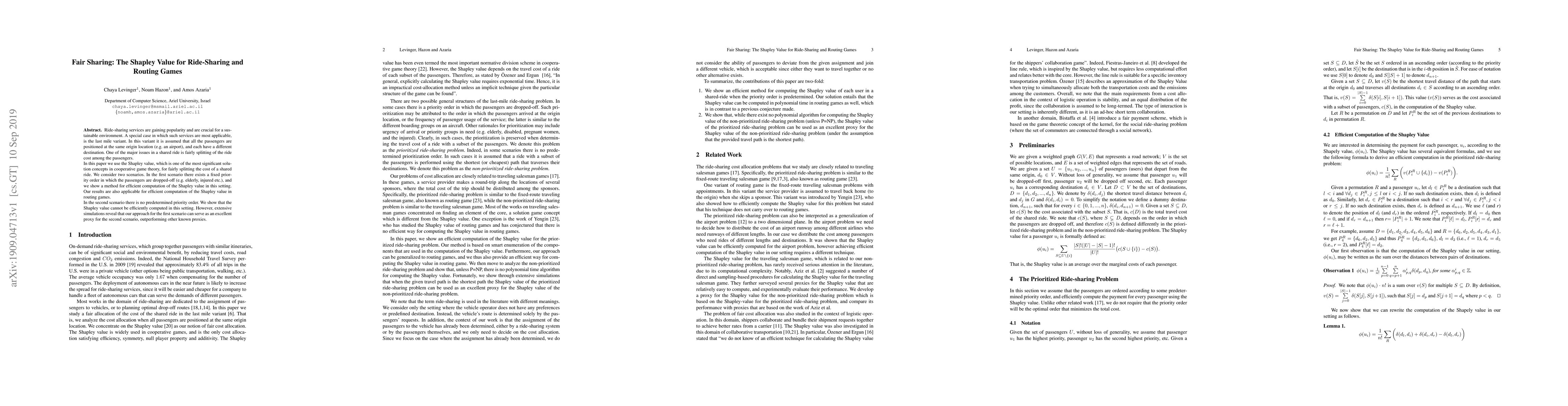 This paper uses the Shapley value to fairly split the cost of a shared ride in two scenarios: one with a fixed priority order and another without. It finds that the Shapley value can be efficiently computed in the first scenario but not in the second, providing an alternative solution for prioritizing passengers.