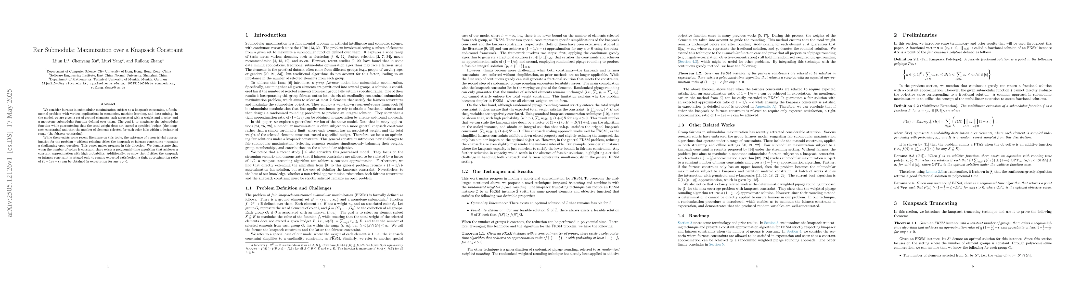 Researchers developed a polynomial-time algorithm to maximize submodular functions under knapsack constraints while ensuring fairness for multiple colors, achieving a constant approximation with high probability. They also showed that relaxing either constraint can lead to a tight approximation ratio of $(1-1/e- ext{ε})$ in expectation.