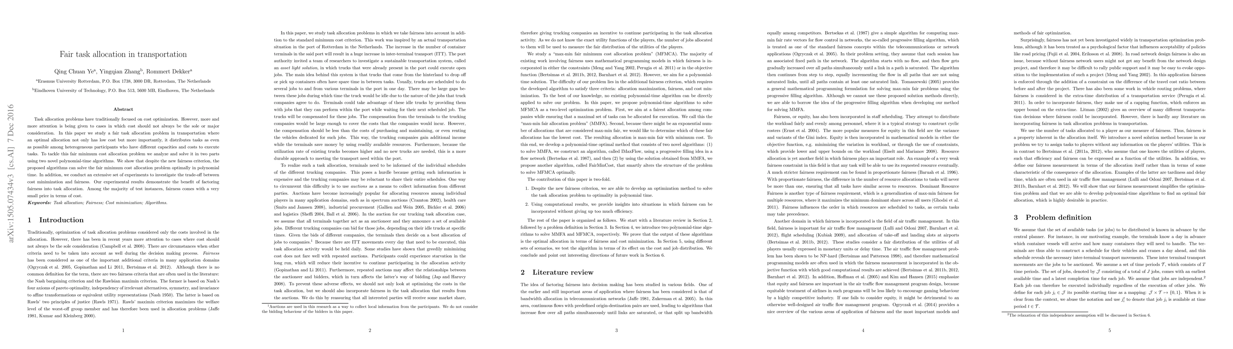 This paper proposes novel polynomial-time algorithms to solve a fair task allocation problem in transportation, balancing cost optimization with equitable distribution among participants. Experimental results show that incorporating fairness into task allocation incurs minimal additional cost.