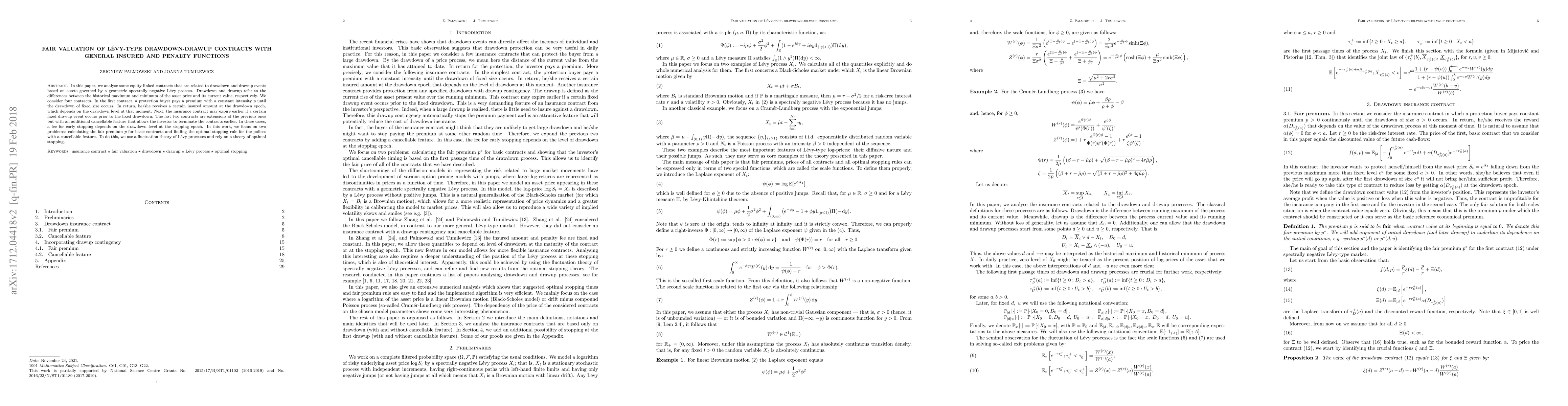 In this paper, we analyse some equity-linked contracts that are related to drawdown and drawup events based on assets governed by a geometric spectrally negative L\'evy process. Drawdown and drawup refer to the differences between the historical maximum and minimum of the asset price and its current value, respectively. We consider four contracts. In the first contract, a protection buyer pays a premium with a constant intensity $p$ until the drawdown of fixed size occurs. In return, he/she receives a certain insured amount at the drawdown epoch, which depends on the drawdown level at that moment. Next, the insurance contract may expire earlier if a certain fixed drawup event occurs prior to the fixed drawdown. The last two contracts are extensions of the previous ones but with an additional cancellable feature that allows the investor to terminate the contracts earlier. In these cases, a fee for early stopping depends on the drawdown level at the stopping epoch. In this work, we focus on two problems: calculating the fair premium $p$ for basic contracts and finding the optimal stopping rule for the polices with a cancellable feature. To do this, we use a fluctuation theory of L\'evy processes and rely on a theory of optimal stopping.