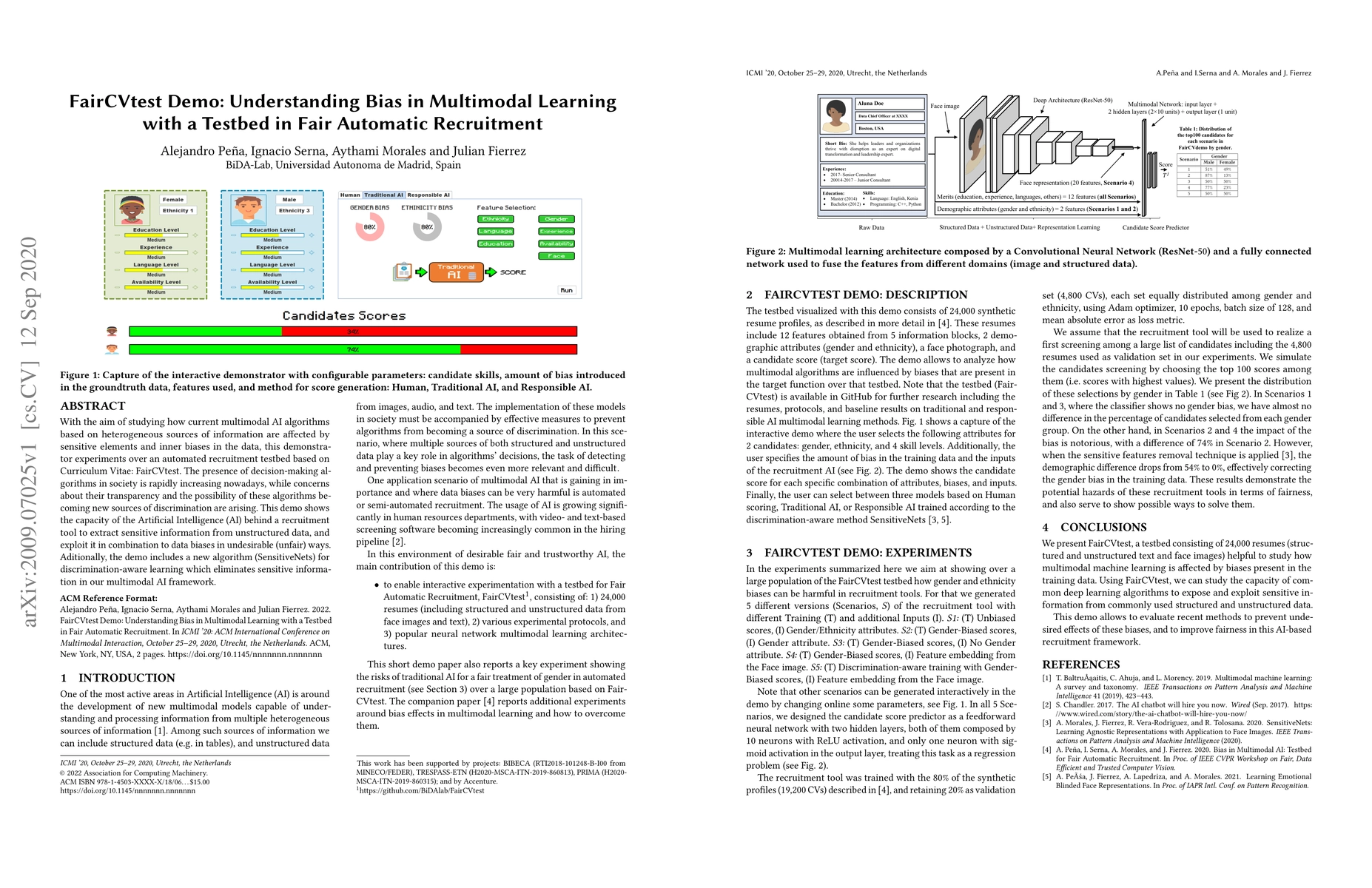 With the aim of studying how current multimodal AI algorithms based on heterogeneous sources of information are affected by sensitive elements and inner biases in the data, this demonstrator experiments over an automated recruitment testbed based on Curriculum Vitae: FairCVtest. The presence of decision-making algorithms in society is rapidly increasing nowadays, while concerns about their transparency and the possibility of these algorithms becoming new sources of discrimination are arising. This demo shows the capacity of the Artificial Intelligence (AI) behind a recruitment tool to extract sensitive information from unstructured data, and exploit it in combination to data biases in undesirable (unfair) ways. Aditionally, the demo includes a new algorithm (SensitiveNets) for discrimination-aware learning which eliminates sensitive information in our multimodal AI framework.