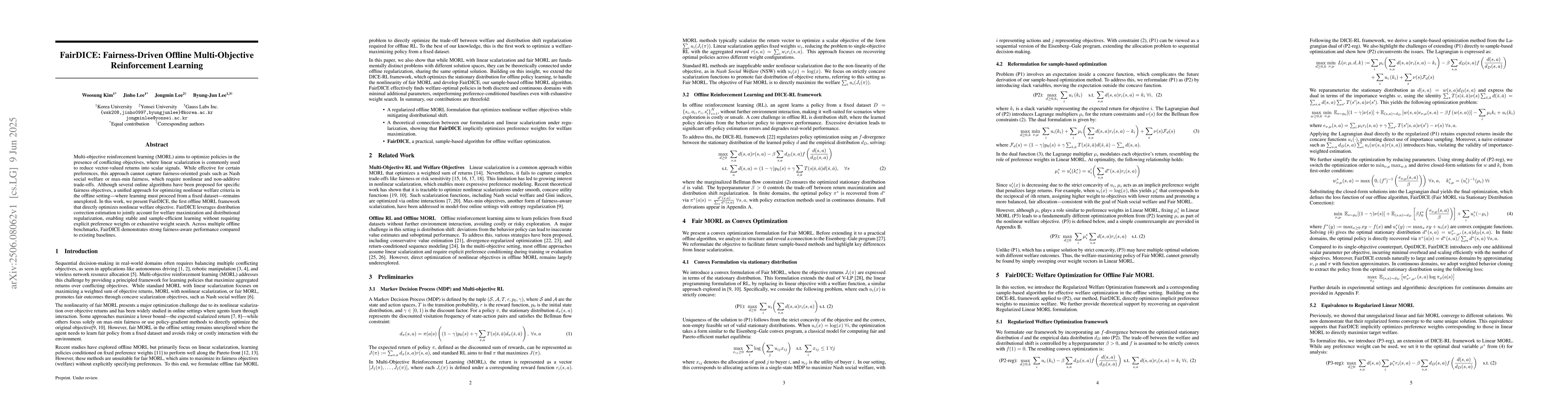 FairDICE is an offline multi-objective reinforcement learning framework that optimizes nonlinear welfare objectives without requiring explicit preference weights or exhaustive weight search. It demonstrates strong fairness-aware performance compared to existing baselines in multiple offline benchmarks.