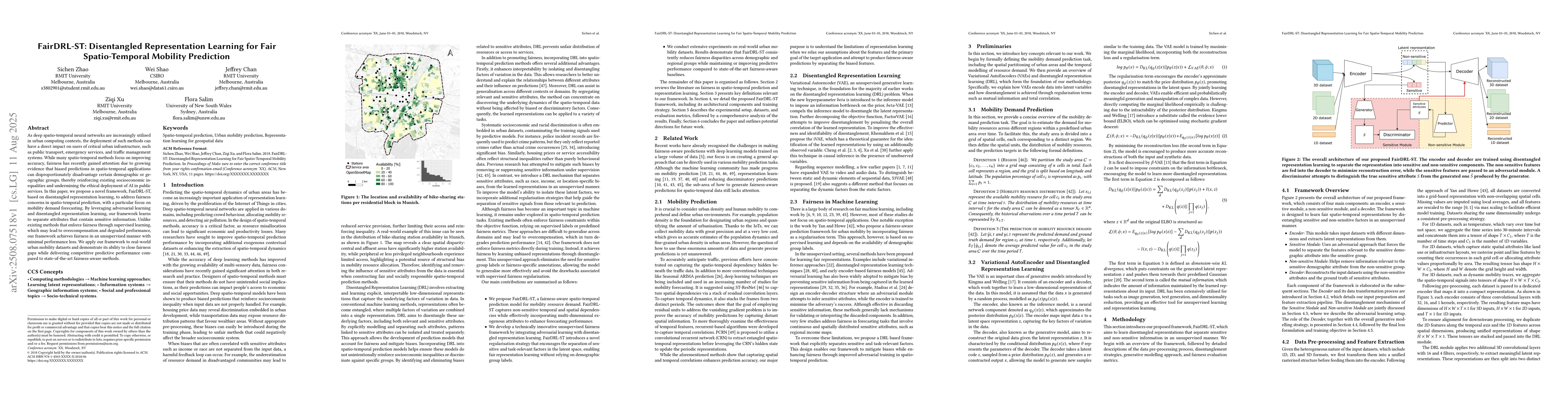 The paper proposes FairDRL-ST, a framework that uses disentangled representation learning with adversarial learning to separate sensitive and non-sensitive information in spatio-temporal prediction, specifically for mobility demand forecasting. It leverages Variational AutoEncoders (VAEs) and disentangled representation learning (DRL) to achieve fairness in an unsupervised manner with minimal performance loss.