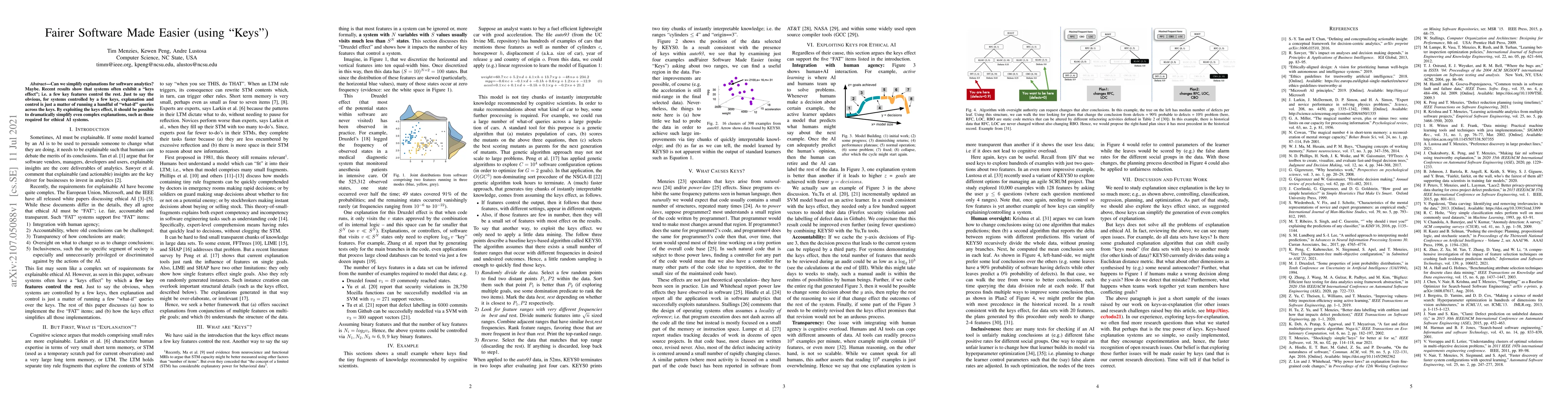 Can we simplify explanations for software analytics? Maybe. Recent results show that systems often exhibit a "keys effect"; i.e. a few key features control the rest. Just to say the obvious, for systems controlled by a few keys, explanation and control is just a matter of running a handful of "what-if" queries across the keys. By exploiting the keys effect, it should be possible to dramatically simplify even complex explanations, such as those required for ethical AI systems.