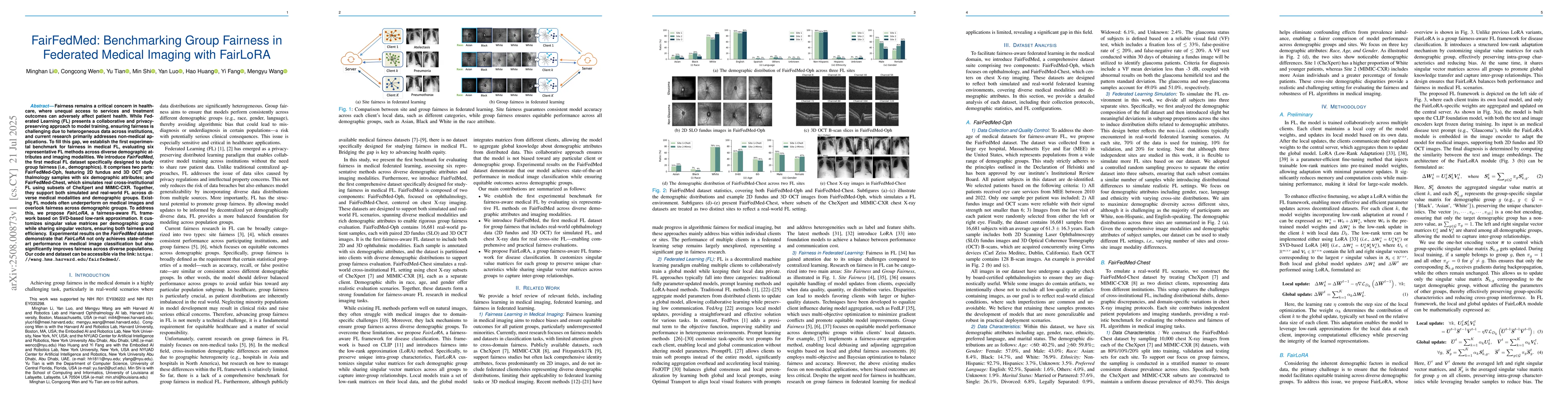 Fairness remains a critical concern in healthcare, where unequal access to services and treatment outcomes can adversely affect patient health. While Federated Learning (FL) presents a collaborative and privacy-preserving approach to model training, ensuring fairness is challenging due to heterogeneous data across institutions, and current research primarily addresses non-medical applications. To fill this gap, we establish the first experimental benchmark for fairness in medical FL, evaluating six representative FL methods across diverse demographic attributes and imaging modalities. We introduce FairFedMed, the first medical FL dataset specifically designed to study group fairness (i.e., demographics). It comprises two parts: FairFedMed-Oph, featuring 2D fundus and 3D OCT ophthalmology samples with six demographic attributes; and FairFedMed-Chest, which simulates real cross-institutional FL using subsets of CheXpert and MIMIC-CXR. Together, they support both simulated and real-world FL across diverse medical modalities and demographic groups. Existing FL models often underperform on medical images and overlook fairness across demographic groups. To address this, we propose FairLoRA, a fairness-aware FL framework based on SVD-based low-rank approximation. It customizes singular value matrices per demographic group while sharing singular vectors, ensuring both fairness and efficiency. Experimental results on the FairFedMed dataset demonstrate that FairLoRA not only achieves state-of-the-art performance in medical image classification but also significantly improves fairness across diverse populations. Our code and dataset can be accessible via link: https://wang.hms.harvard.edu/fairfedmed/.