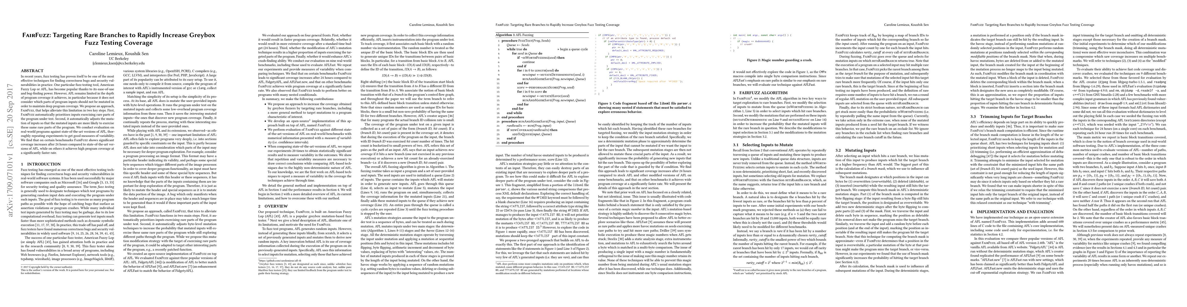 FairFuzz enhances greybox fuzz testing by prioritizing rare program branches and adjusting input mutations to achieve deeper coverage, significantly outperforming state-of-the-art AFL in coverage gains and speed.