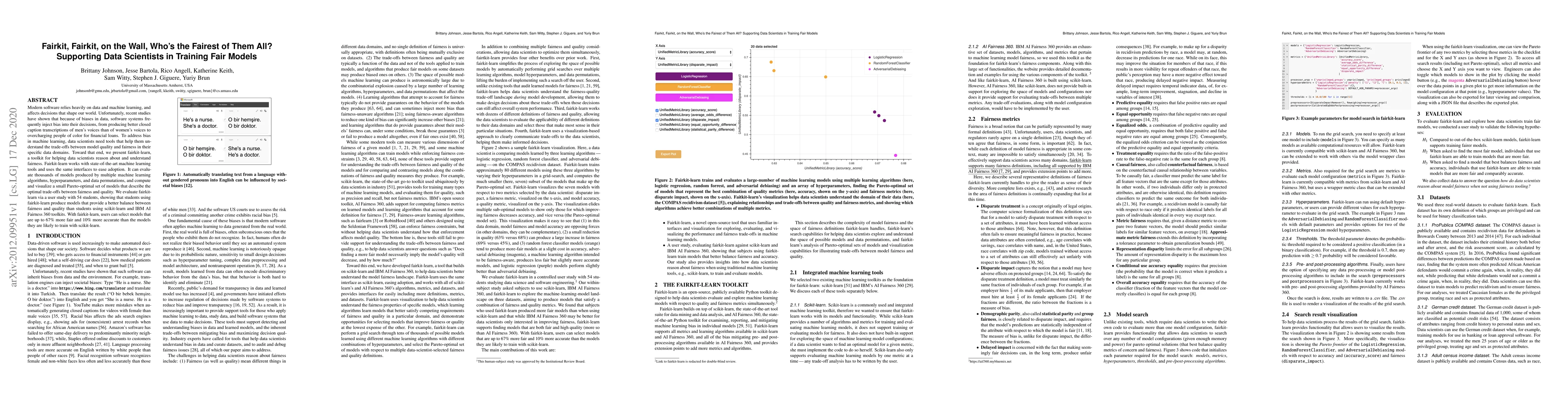 This paper introduces fairkit-learn, a toolkit designed to assist data scientists in training fair machine learning models by balancing model quality with fairness. The toolkit evaluates and visualizes trade-offs between fairness and accuracy, helping users select optimal models, and was shown to outperform other fairness tools in a user study with 54 students.