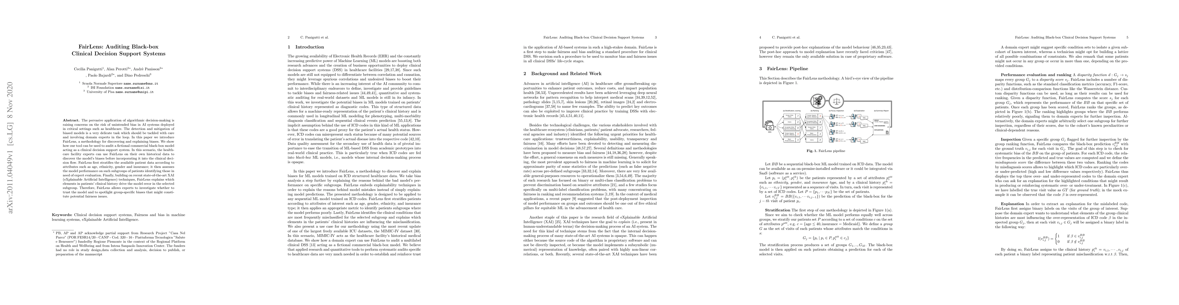 FairLens is a methodology for auditing black-box clinical decision support systems to detect and explain biases. It stratifies patient data by demographics and assesses model performance, identifying subgroups for expert evaluation and explaining factors driving model errors.