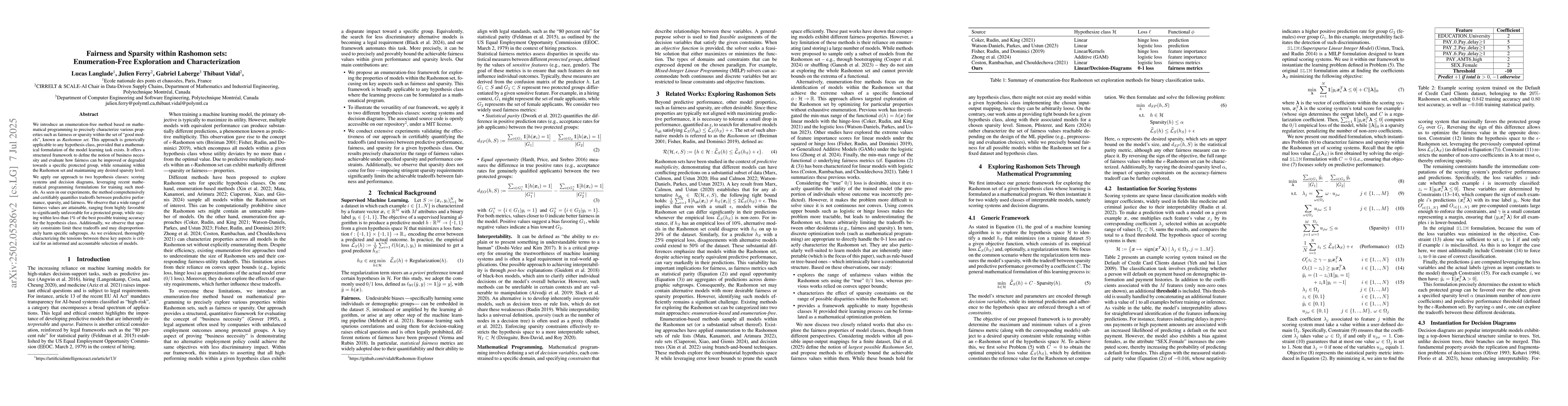 We introduce an enumeration-free method based on mathematical programming to precisely characterize various properties such as fairness or sparsity within the set of "good models", known as Rashomon set. This approach is generically applicable to any hypothesis class, provided that a mathematical formulation of the model learning task exists. It offers a structured framework to define the notion of business necessity and evaluate how fairness can be improved or degraded towards a specific protected group, while remaining within the Rashomon set and maintaining any desired sparsity level. We apply our approach to two hypothesis classes: scoring systems and decision diagrams, leveraging recent mathematical programming formulations for training such models. As seen in our experiments, the method comprehensively and certifiably quantifies trade-offs between predictive performance, sparsity, and fairness. We observe that a wide range of fairness values are attainable, ranging from highly favorable to significantly unfavorable for a protected group, while staying within less than 1% of the best possible training accuracy for the hypothesis class. Additionally, we observe that sparsity constraints limit these trade-offs and may disproportionately harm specific subgroups. As we evidenced, thoroughly characterizing the tensions between these key aspects is critical for an informed and accountable selection of models.