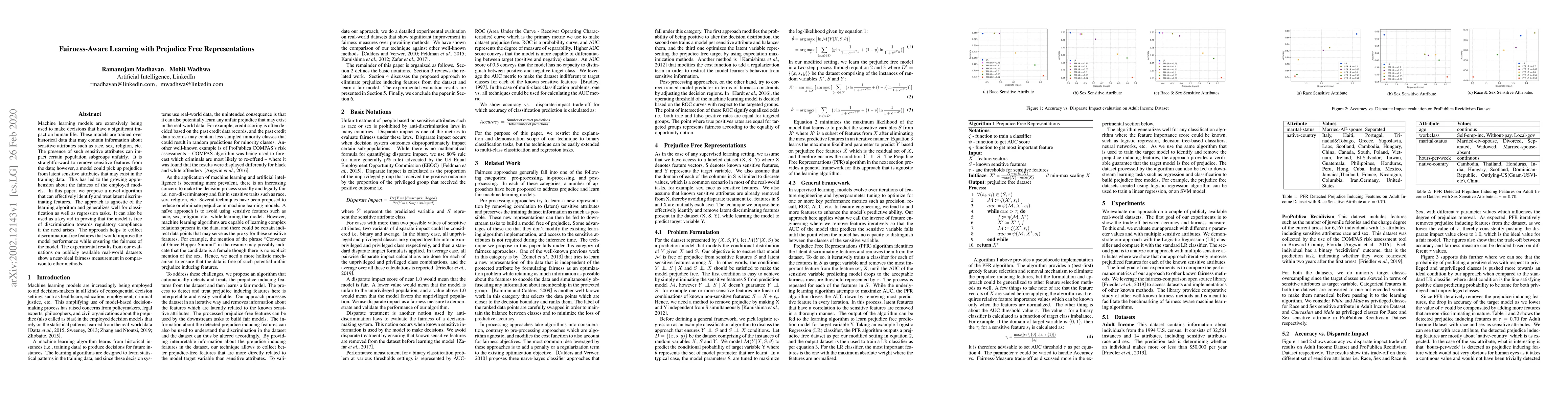 Machine learning models are extensively being used to make decisions that have a significant impact on human life. These models are trained over historical data that may contain information about sensitive attributes such as race, sex, religion, etc. The presence of such sensitive attributes can impact certain population subgroups unfairly. It is straightforward to remove sensitive features from the data; however, a model could pick up prejudice from latent sensitive attributes that may exist in the training data. This has led to the growing apprehension about the fairness of the employed models. In this paper, we propose a novel algorithm that can effectively identify and treat latent discriminating features. The approach is agnostic of the learning algorithm and generalizes well for classification as well as regression tasks. It can also be used as a key aid in proving that the model is free of discrimination towards regulatory compliance if the need arises. The approach helps to collect discrimination-free features that would improve the model performance while ensuring the fairness of the model. The experimental results from our evaluations on publicly available real-world datasets show a near-ideal fairness measurement in comparison to other methods.