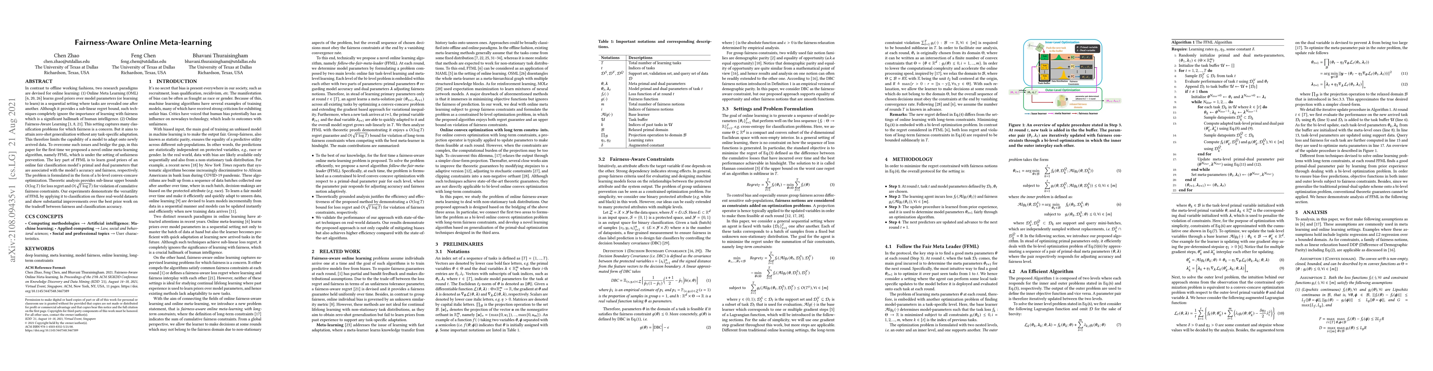 The paper proposes FFML, a novel online meta-learning algorithm designed for unfairness prevention in a sequential task setting. FFML learns good priors of an online fair classification model's primal and dual parameters, formulated as a bi-level convex-concave optimization problem.
