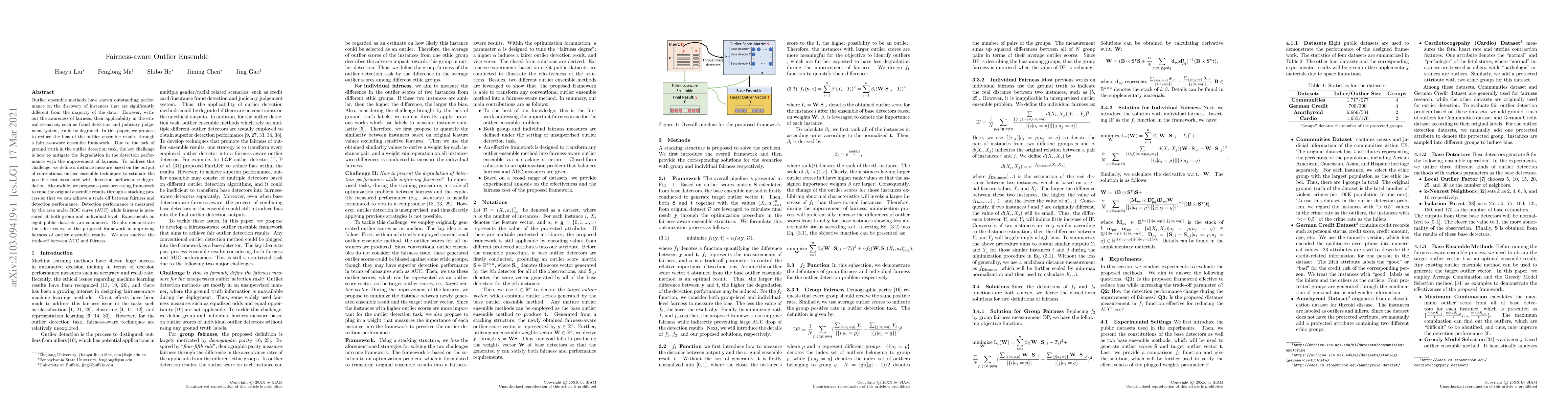 This paper proposes a fairness-aware outlier ensemble framework to mitigate bias in outlier detection, balancing fairness and detection performance. The method introduces a distance measure and a post-processing stacking process to achieve this balance, measured by AUC and fairness metrics at both group and individual levels.