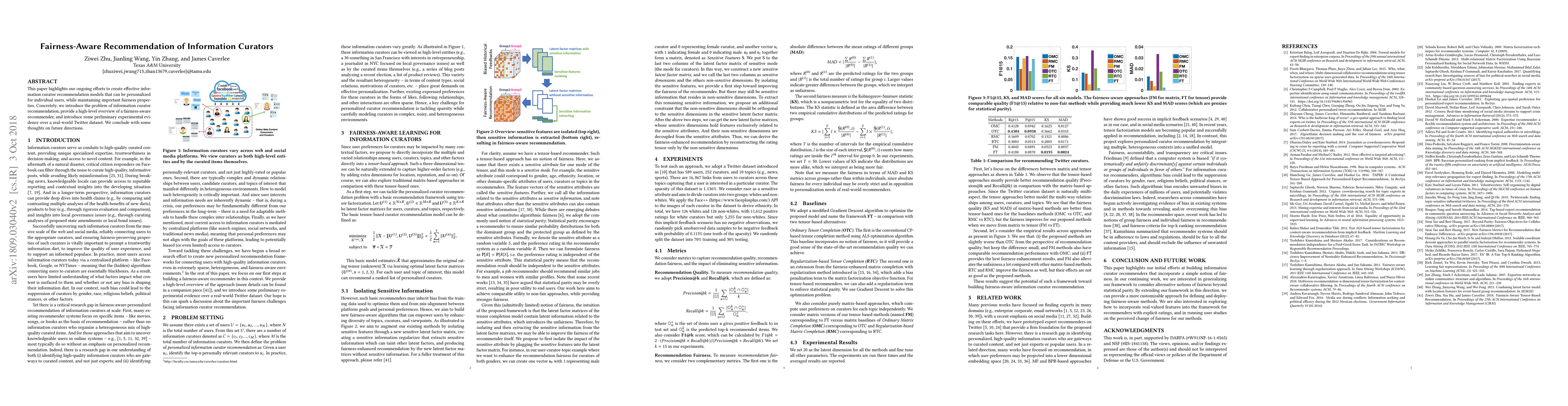 This paper develops personalized models for recommending information curators while ensuring fairness, presenting an overview of a fairness-aware recommender and preliminary results from a Twitter dataset, with future research directions outlined.